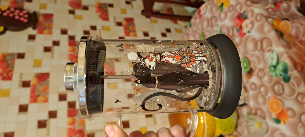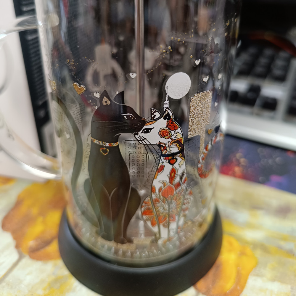 очень красивый заварочник., внутри упакован в пупырку., с двух сторон фото котиков в разных позициях)
