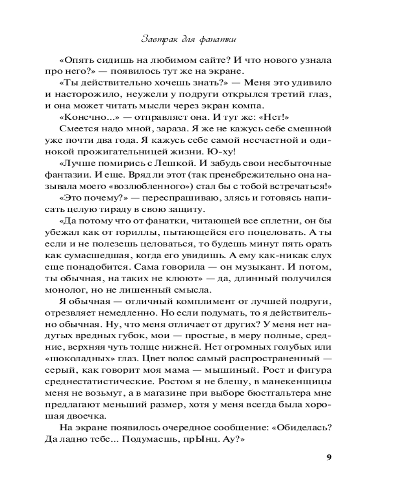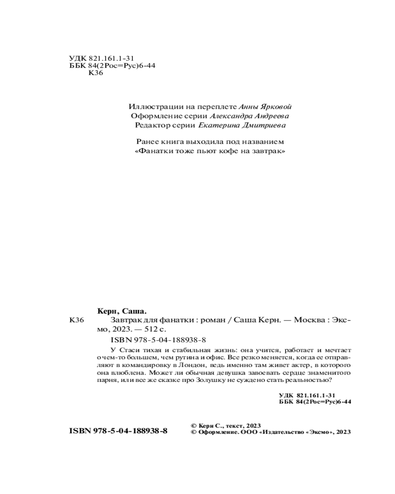 💳 Оплатить за товар можно при получении 🇰🇿 Есть бесплатная доставка по Казахстану от 1 дня 🎁 Копите бонусы с каждой покупки Серия: Любовь в каждой строчке. Романы для уютного вечера «Завтрак для фанатки» — это увлекательная книга о сложном, но интересном пути фанатки, которая хочет добиться сердца знаменитого актера. Каждая девушка хотя бы раз была влюблена в идеального парня, смотрящего на нее с экрана телевизора. Главная героиня же решила не сидеть на месте и хотя бы попытаться исполнить мечту. Получится ли у нее это сделать? |