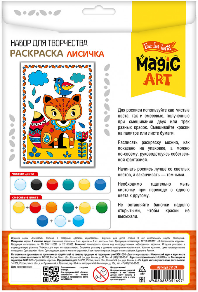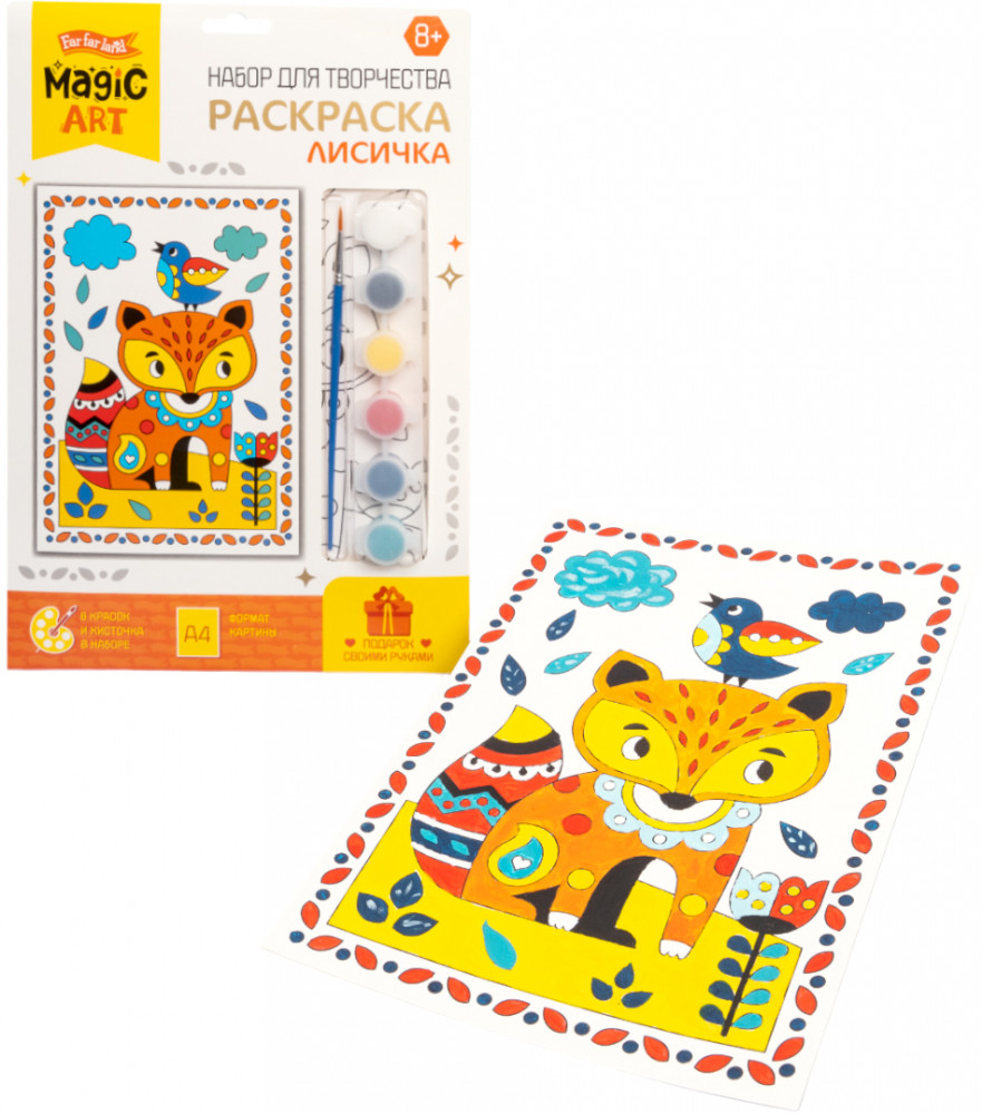 💳 Оплатить за товар можно при получении 🇰🇿 Есть бесплатная доставка по Казахстану от 1 дня 🎁 Копите бонусы с каждой покупки Серия: Magic art Раскраска для детей «Лисичка» — это набор с кисточкой и красками для раскрашивания, который поможет проявить творческие способности ребенка. Готовая картина украсит интерьер или станет замечательной открыткой для друзей и близких. Раскрасьте рисунок красками, как показано на упаковке или на свой вкус. Экспериментируйте с цветами! Для получения новых оттенков, смешивайте краски на листе бумаги или палитре. Набор способствует развитию фантазии, творческих навыков ребенка, чувства цвета и мелкой моторики. |