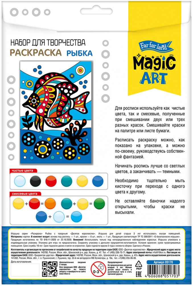 💳 Оплатить за товар можно при получении 🇰🇿 Есть бесплатная доставка по Казахстану от 1 дня 🎁 Копите бонусы с каждой покупки Серия: Magic art Раскраска для детей «Рыбка» — это набор с кисточкой и красками для раскрашивания, который поможет проявить творческие способности ребенка. Готовая картина украсит интерьер или станет замечательной открыткой для друзей и близких. Раскрасьте рисунок красками, как показано на упаковке или на свой вкус. Экспериментируйте с цветами! Для получения новых оттенков, смешивайте краски на листе бумаги или палитре. Набор способствует развитию фантазии, творческих навыков ребенка, чувства цвета и мелкой моторики. |