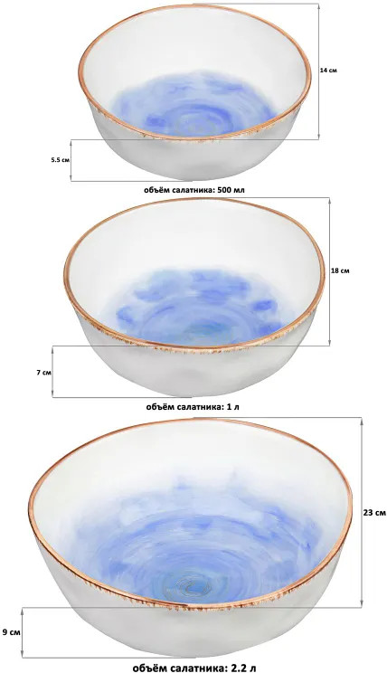 14 × 14 × 5,5 см, 18 × 18 × 7 cм, 23 × 23 × 9 см