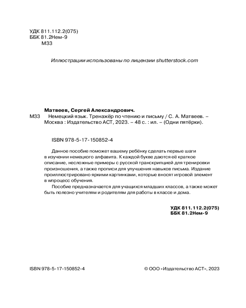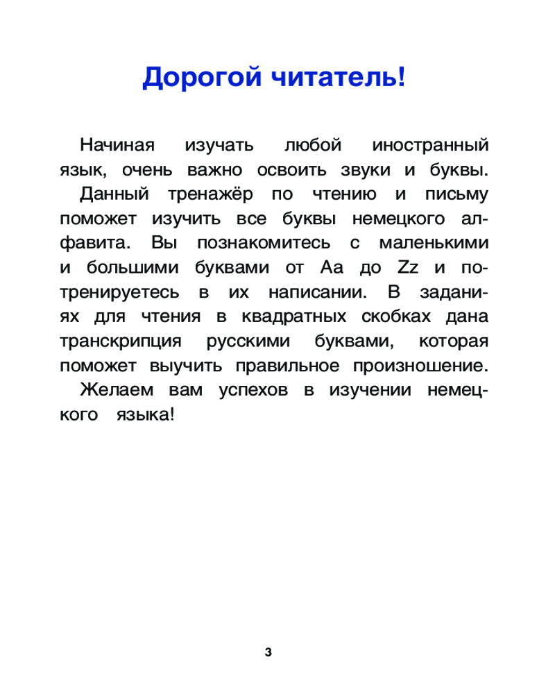 Немецкий язык. Тренажёр по чтению и письмуВ данный момент этот товар отсутствует в продаже. Возможно, у нас найдется аналогичный или похожий товар здесь. Серия: Одни пятёрки Данное пособие поможет вашему ребёнку сделать первые шаги в изучении немецкого алфавита. К каждой букве даются её краткое описание, несложные примеры с русской транскрипцией для тренировки произношения, а также прописи для улучшения навыков письма. Издание проиллюстрировано яркими картинками, которые вносят игровой элемент в процесс обучения. Пособие предназначается для учащихся младших классов, а также может быть полезно учителям и родителям для работы в классе и дома. |