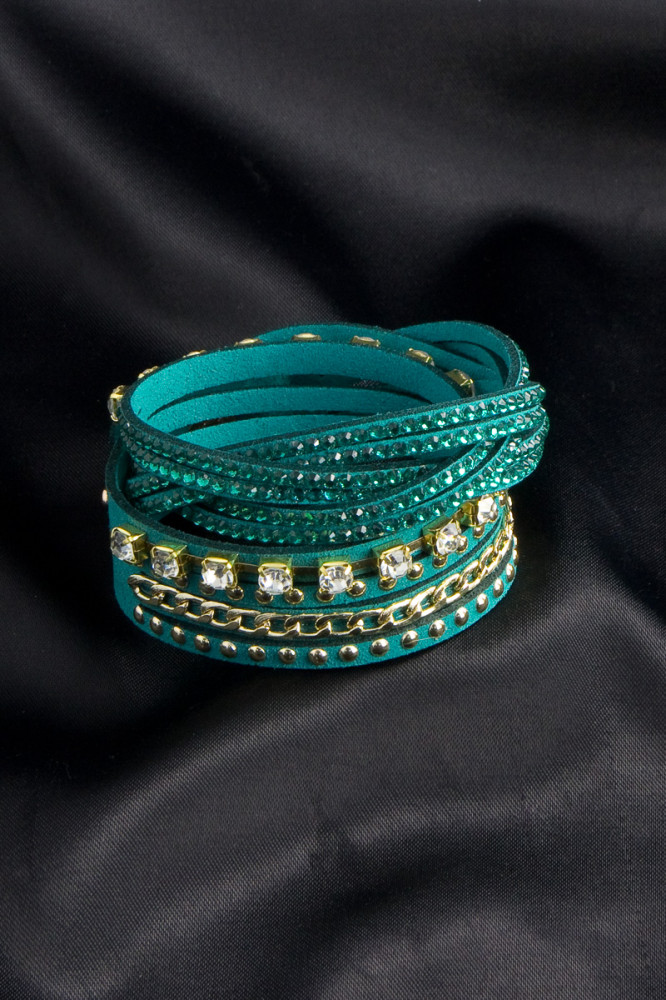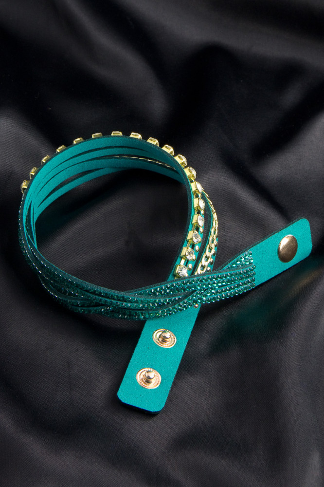 Бирюзовый браслет из замши с застежкой-кнопка, украшен золотой цепочкой, прозрачными и бирюзовыми стразами. Аксессуары — это способ проявить себя и своё чувство стиля, с ними вы можете подчеркнуть свои достоинства, привлечь внимание и создать неповторимый образ.
