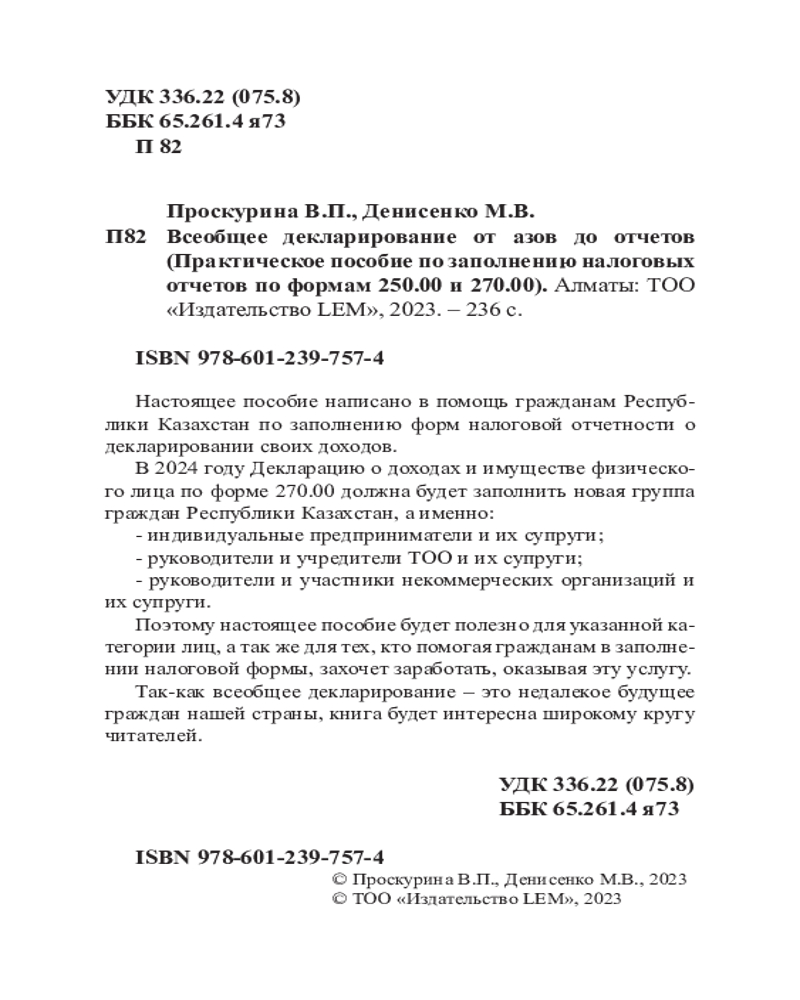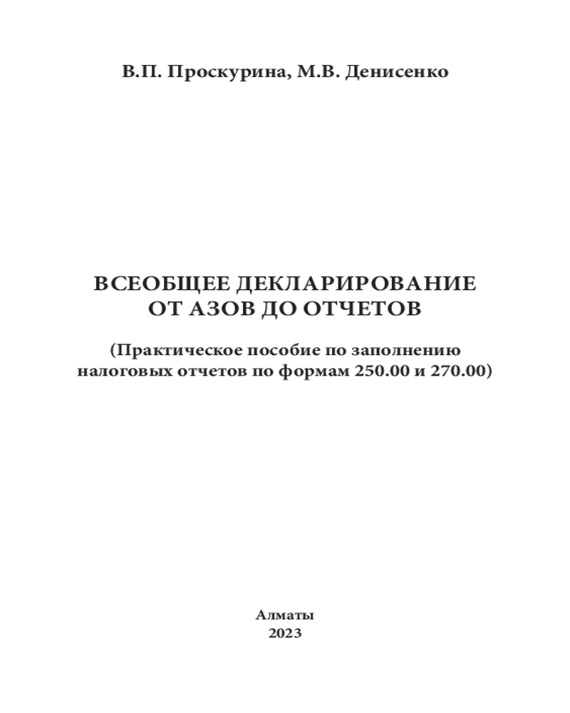 Всеобщее Декларирование от Азов до Отчетов. Практическое пособие по заполнению налоговых отчетов по формам 250.00 и 270.00М.В. Денисенко, В. П. Проскурина В данный момент этот товар отсутствует в продаже. Возможно, у нас найдется аналогичный или похожий товар здесь. Настоящее пособие написано в помощь гражданам Республики Казахстан по заполнению форм налоговой отчетности о декларировании своих доходов. |