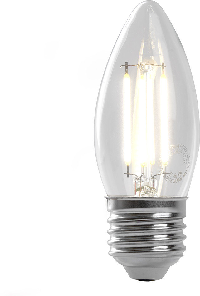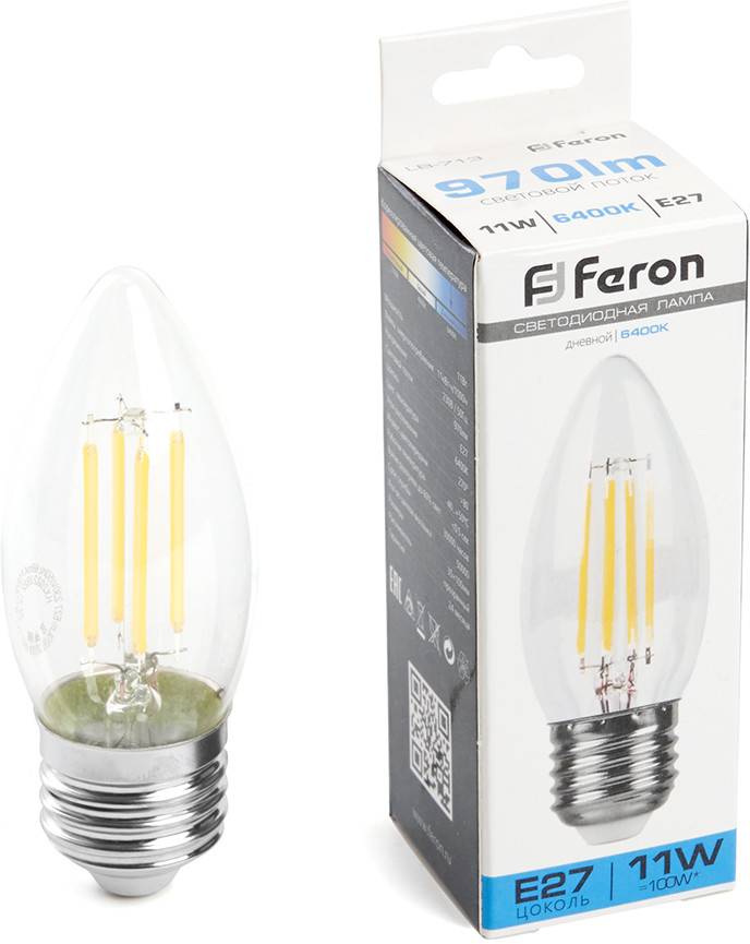 Лампа светодиодная филамент Feron LB-713, C35 (свеча), 11W 230V E27 6400К (дневной), рассеиватель прозрачный 970Lm, угол рассеивания 270°. |