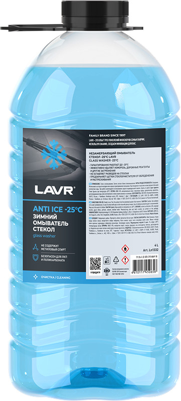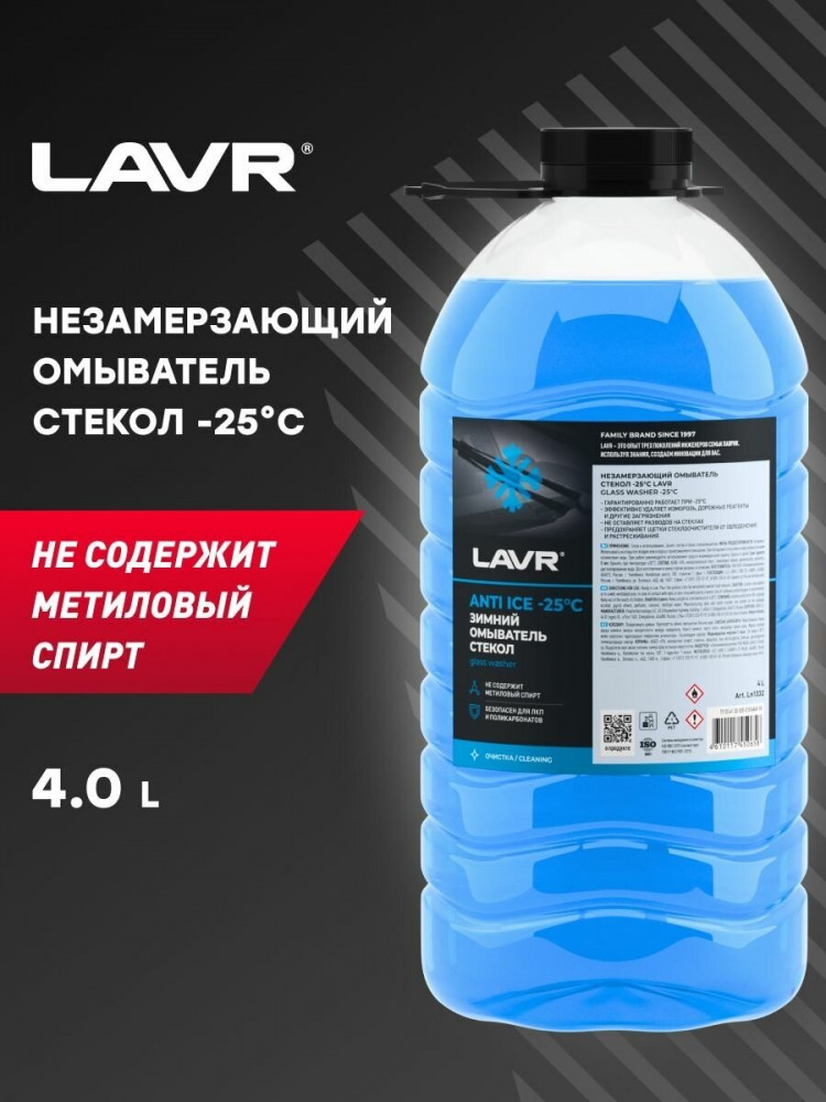 Незамерзающий омыватель стекол Anti-ice −25°C Lavr — средство для омывания стекол автомобиля в зимний период. Быстро удаляет снег, изморозь и загрязнения, защищает стеклоочистители от обледенения и растрескивания, а стекла — от абразивного износа при температуре до −25°C. Не оказывает негативного влияния на ЛКП, резиновые и металлические детали автомобиля.