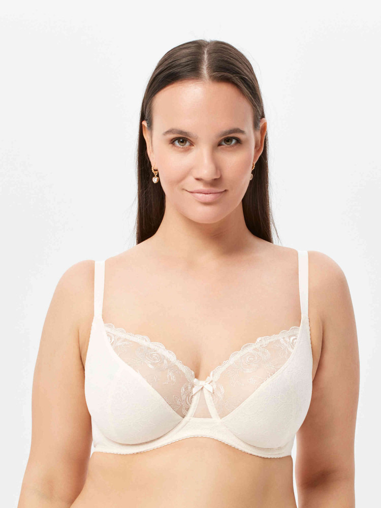Красивый мягкий, смотрится прекрасно и в носке комфортный. Размер соответствует. Ткани бюстгальтера очень тонкие. Но в то же время нижняя половинка дает хорошую поддержки груди. Как и указано в описании - материал чашечки неэластичный. Соответственно, чуть меньше и будет провисать сверху. Чашка с бретелью крепится выше подмышки и этим как раз дает возможность не натирать кожу при движении рук. Рекомендую.