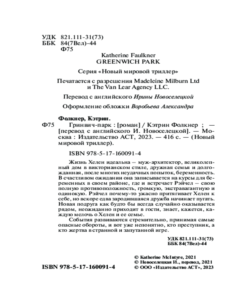 💳 Оплатить за товар можно при получении 🇰🇿 Есть бесплатная доставка по Казахстану от 1 дня 🎁 Копите бонусы с каждой покупки Серия: Новый мировой триллер Жизнь Хелен идеальна — муж-архитектор, великолепный дом в викторианском стиле, дружная семья и долгожданная, после многих неудачных попыток, беременность. В счастливом ожидании она записывается на курсы для беременных в своем районе, где и встречает Рэйчел — свою полную противоположность, громкую, экстравагантную и одинокую. Рэйчел почему-то ужасно притягивает Хелен к себе, но вскоре едва зародившаяся дружба начинает пугать. Новая подруга как будто бы всегда случайно оказывается рядом, неожиданно приходит в гости, знает, кажется, каждую мелочь о Хелен и ее семье. События развиваются стремительно, принимая самые опасные обороты, и вот уже непонятно, кто преступник, а кто жертва в странной и запутанной игре. |