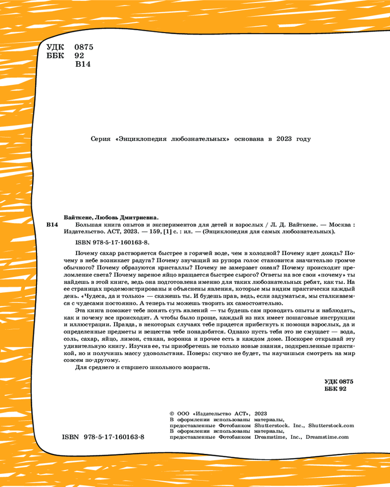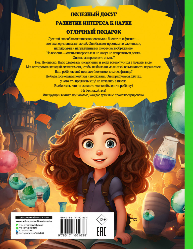 Большая книга опытов и экспериментов для детей и взрослыхВ данный момент этот товар отсутствует в продаже. Возможно, у нас найдется аналогичный или похожий товар здесь. Серия: Энциклопедия любознательных Почему сахар растворяется быстрее в горячей воде, чем в холодной? Почему идет дождь? Почему в небе возникает радуга? Почему звучащий из рупора голос становится значительно громче обычного? Почему образуются кристаллы? Почему не замерзает океан? Почему происходит преломление света? Почему вареное яйцо вращается быстрее сырого? Ответы на все свои «почему» ты найдешь в этой книге, ведь она подготовлена именно для таких любознательных ребят, как ты. На ее страницах продемонстрированы и объяснены явления, которые мы видим практически каждый день. «Чудеса, да и только» — скажешь ты. И будешь прав, ведь, если задуматься, мы сталкиваемся с чудесами постоянно. А теперь ты можешь творить их самостоятельно. |