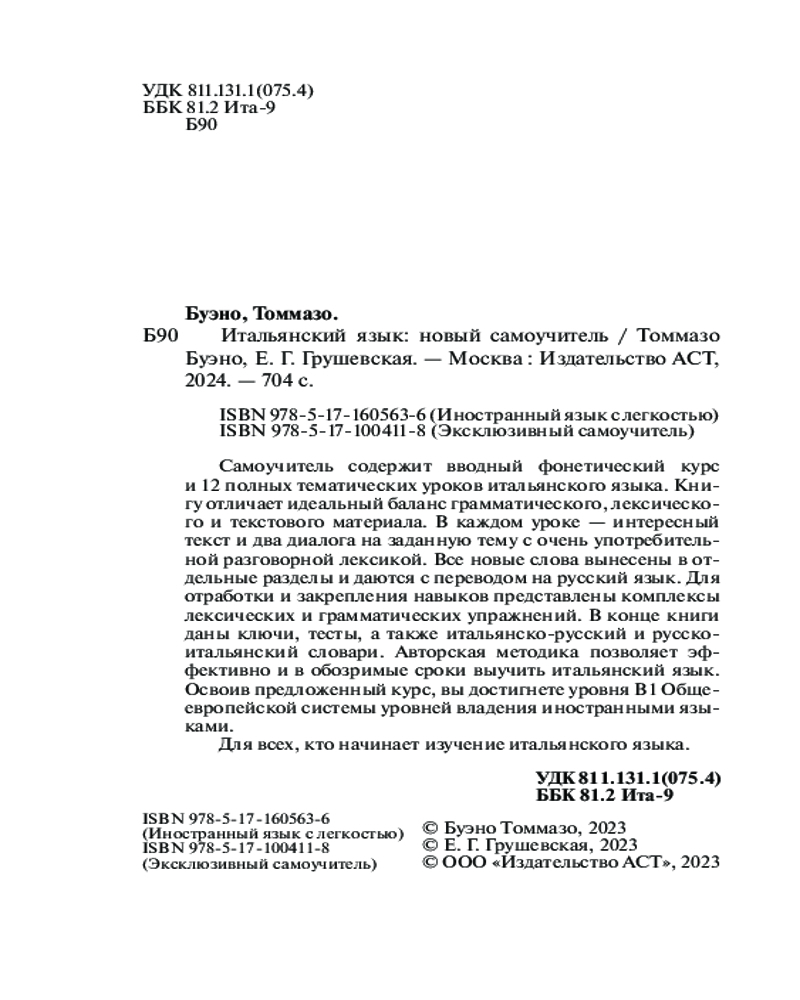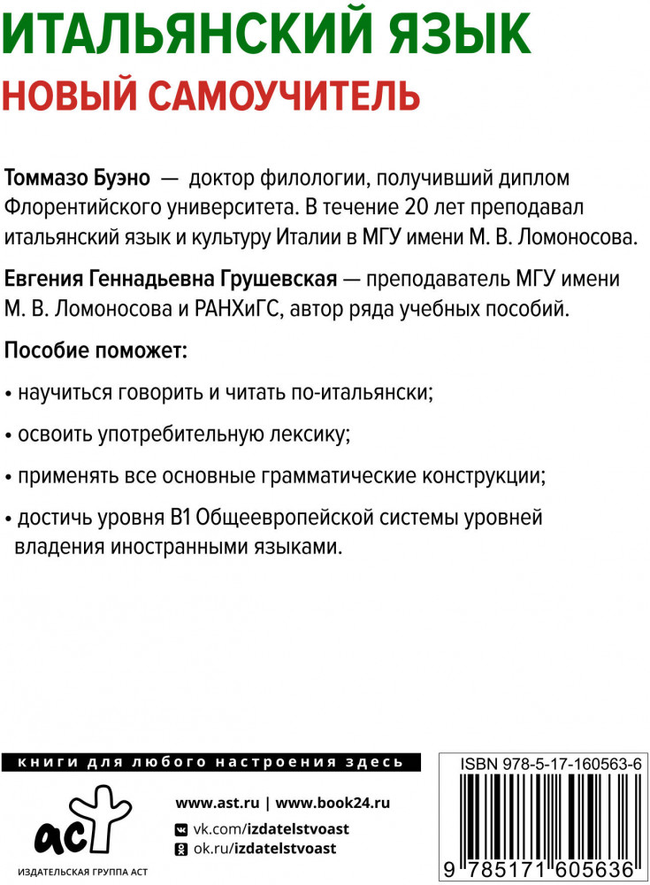 Итальянский язык. Новый самоучительВ данный момент этот товар отсутствует в продаже. Возможно, у нас найдется аналогичный или похожий товар здесь. Серия: Иностранный язык с легкостью Самоучитель содержит вводный фонетический курс и 12 полных тематических уроков итальянского языка. Книгу отличает идеальный баланс грамматического, лексического и текстового материала. В каждом уроке — интересный текст и два диалога на заданную тему с очень употребительной разговорной лексикой. |