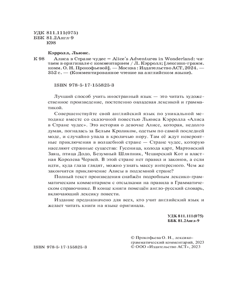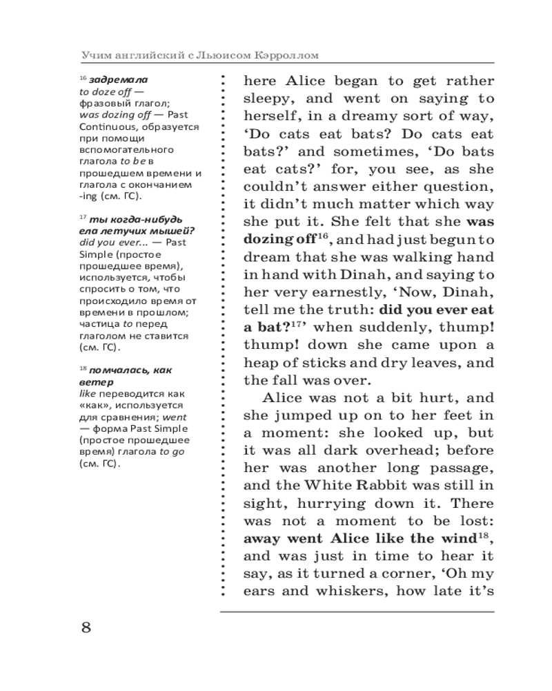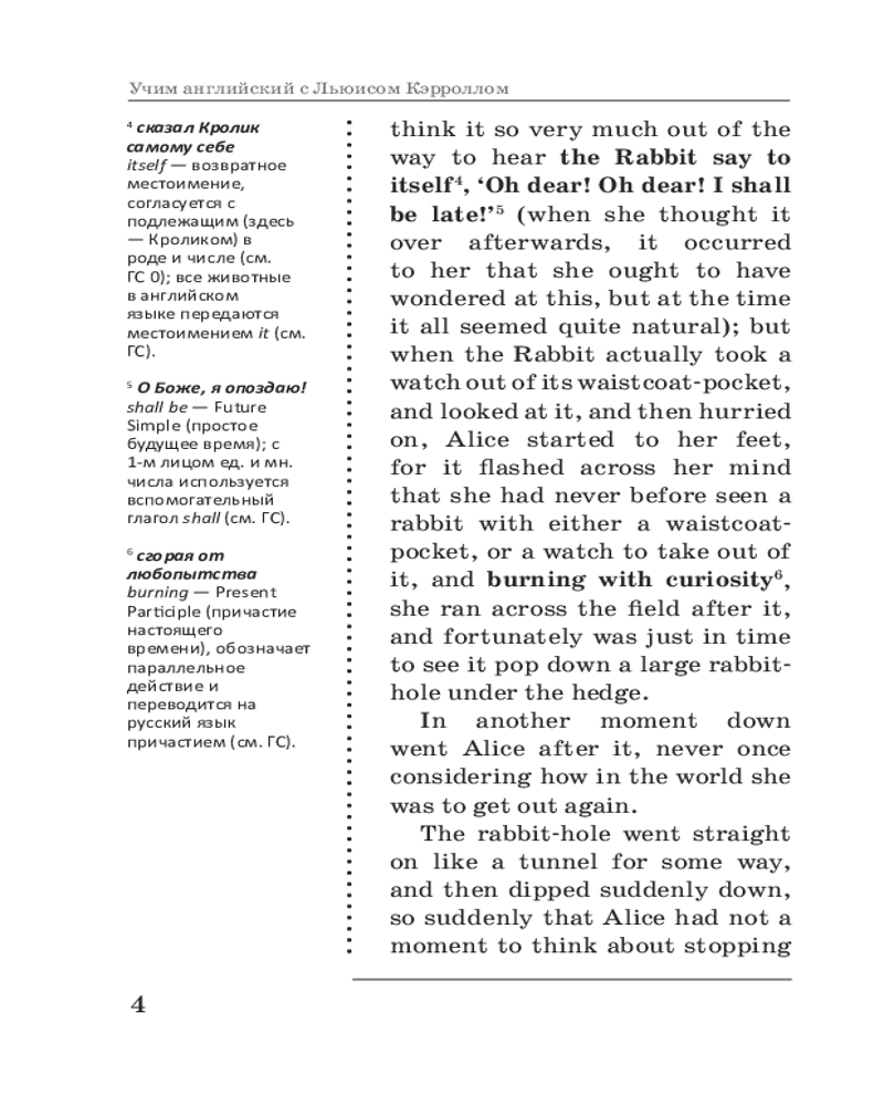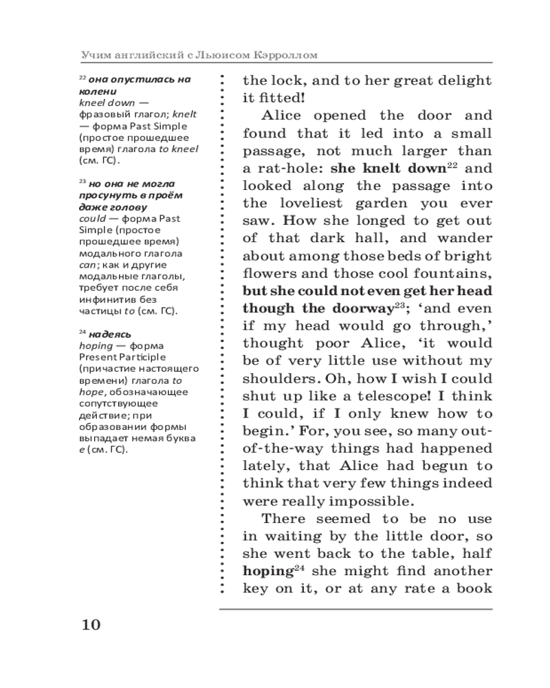 Совершенствуйте свой английский язык по уникальной методике вместе со сказочной повестью Льюиса Кэрролла «Алиса в Стране чудес». Это история о девочке Алисе, которая, недолго думая, погналась за Белым Кроликом, одетым по самой последней моде, и случайно упала в кроличью нору. Там её ждут невероятные приключения в волшебной стране — Стране чудес, которую населяют странные существа: Гусеница, колода карт, Мартовский Заяц, птица Додо, Безумный Шляпник, Чеширский Кот и властная Королева Червей. В этой стране нет правил и законов, а если идти, куда глаза глядят, можно узнать массу интересного. Чем же закончится приключение Алисы в подземной стране?
