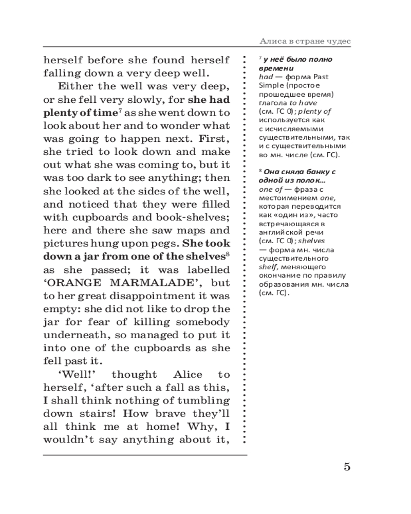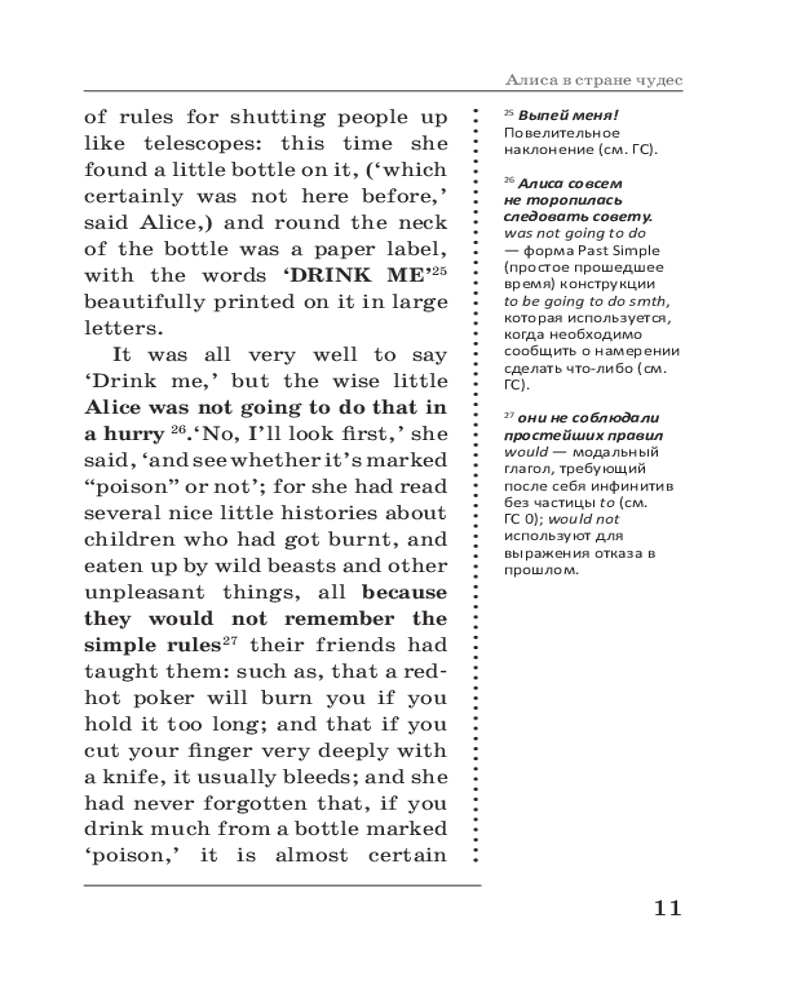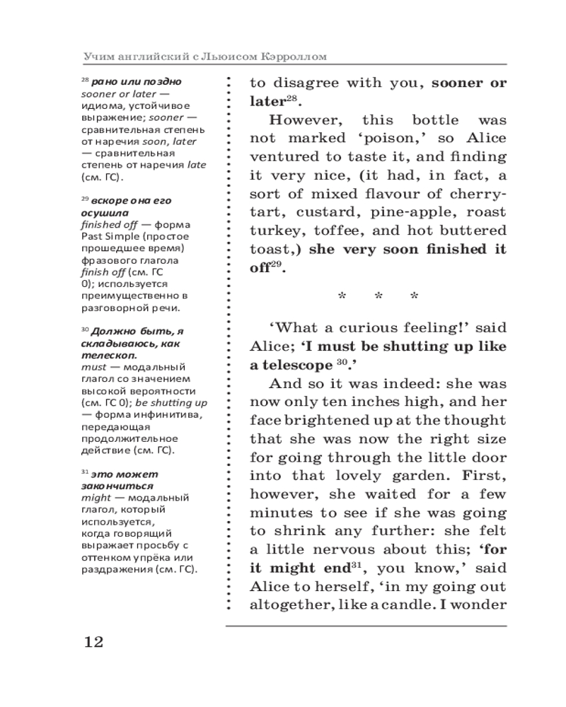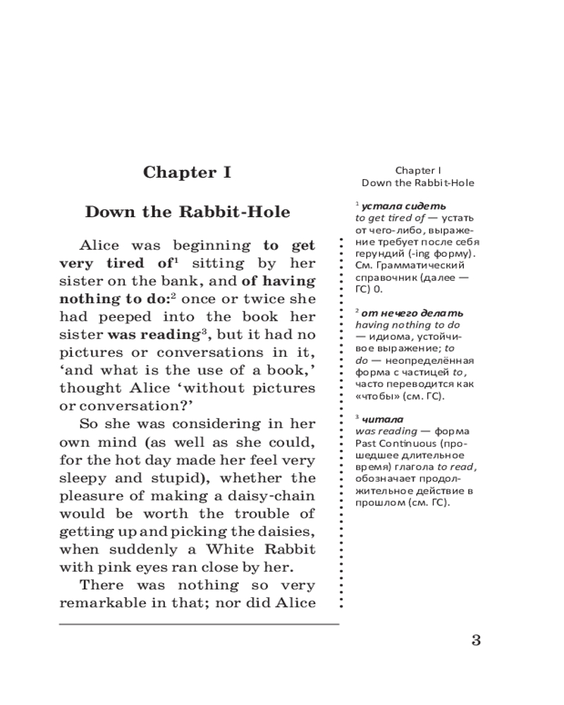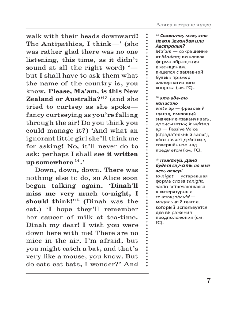 Совершенствуйте свой английский язык по уникальной методике вместе со сказочной повестью Льюиса Кэрролла «Алиса в Стране чудес». Это история о девочке Алисе, которая, недолго думая, погналась за Белым Кроликом, одетым по самой последней моде, и случайно упала в кроличью нору. Там её ждут невероятные приключения в волшебной стране — Стране чудес, которую населяют странные существа: Гусеница, колода карт, Мартовский Заяц, птица Додо, Безумный Шляпник, Чеширский Кот и властная Королева Червей. В этой стране нет правил и законов, а если идти, куда глаза глядят, можно узнать массу интересного. Чем же закончится приключение Алисы в подземной стране?