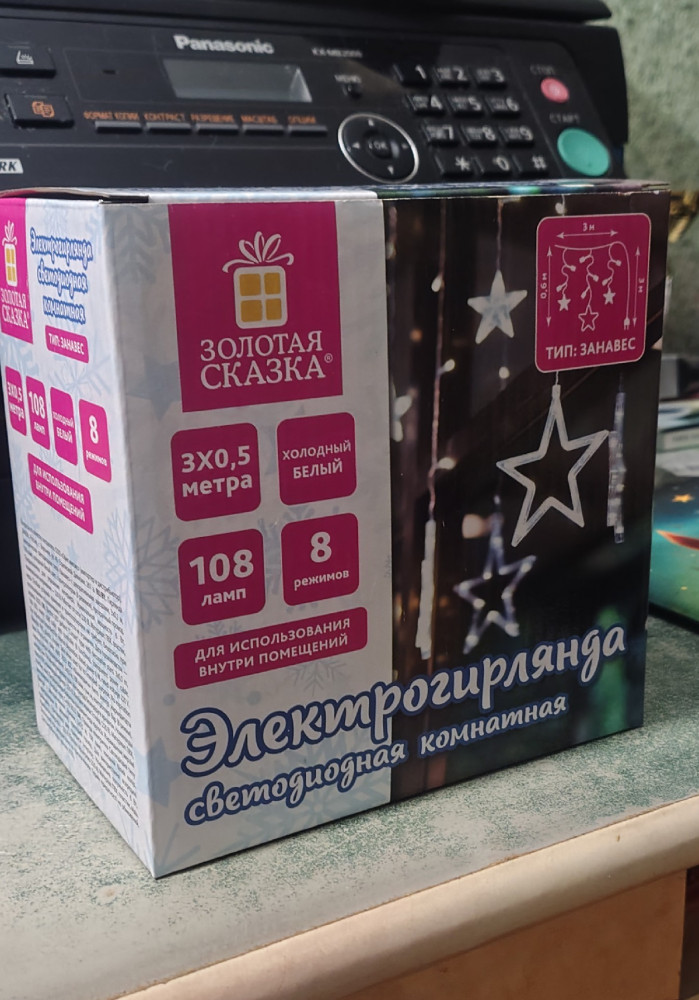 В хорошей, добротной, картонной коробке. Взяли холодный серебристый цвет. Красивая, провода крепкие. При размещении провод мелких звёзд аккуратно медленно раскрутить вокруг себя. Вечером с закрытыми шторами можно даже не включать свет, освещение как от ночного светильника, всё видно. Свет не слепит глаза.