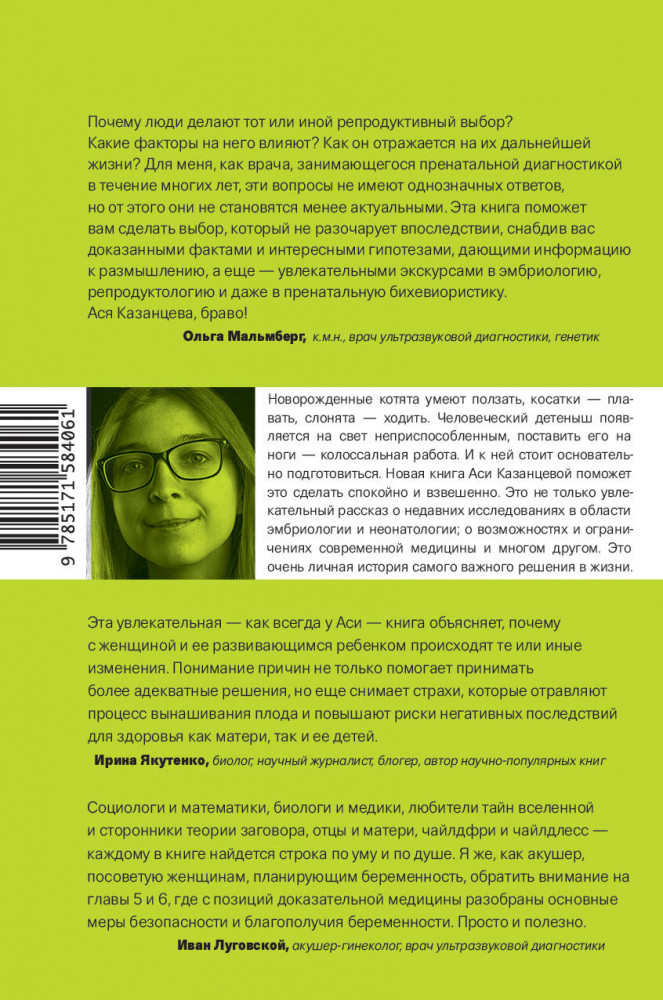 Научная журналистка, популяризатор науки и молодая мать Ася Казанцева очень удивилась бы, если бы пять лет назад ей сказали, что она так рано захочет ребенка. Эта ее книга, четвертая по счету, особенная: в ней автор, как всегда, профессионально и увлекательно, рассказывает о недавних исследованиях в области эмбриологии, неонатологии и экстракорпорального оплодотворения; о реальных и мифических рисках для матери и плода; о возможностях и ограничениях современной медицины. Но это не все. Это еще и личная история самого важного решения в жизни и начала большой любви. |