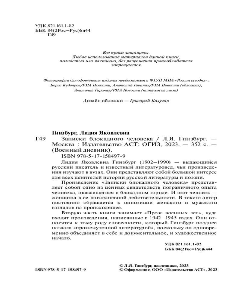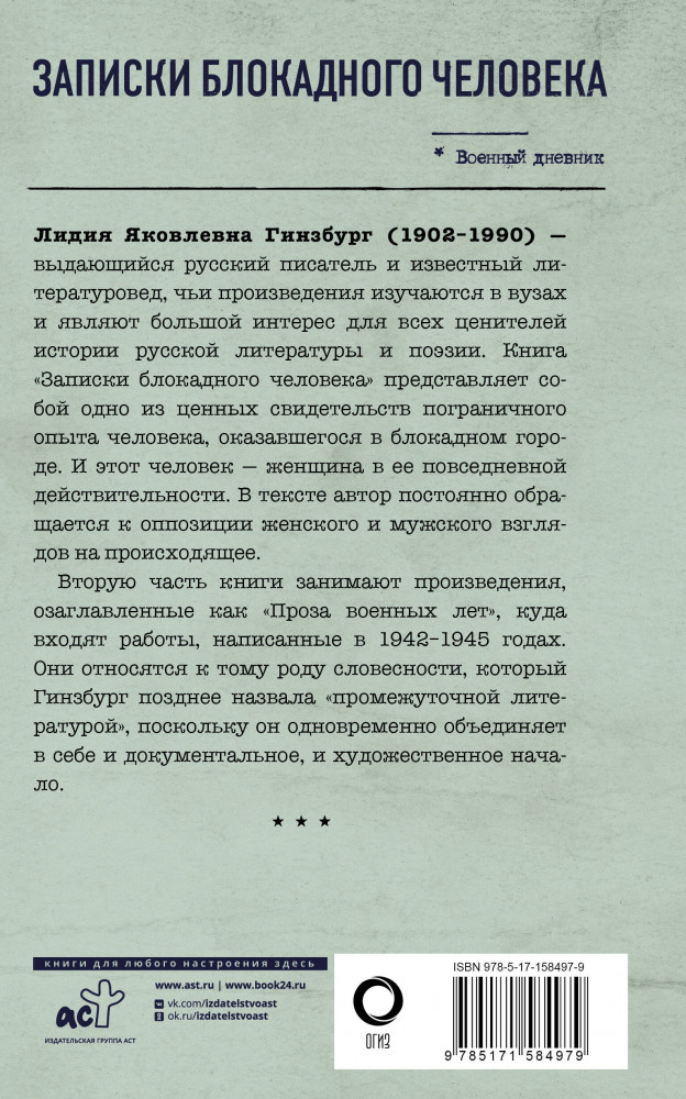 💳 Оплатить за товар можно при получении 🇰🇿 Есть бесплатная доставка по Казахстану от 1 дня 🎁 Копите бонусы с каждой покупки Серия: Военный дневник Лидия Яковлевна Гинзбург (1902-1990) — выдающийся русский писатель и известный литературовед, чьи произведения изучают в вузах и являют большой интерес для всех ценителей истории русской литературы и поэзии. Ее произведение «Записки блокадного человека» представляет собой одно из ценных свидетельств пограничного опыта человека, оказавшегося в блокадном городе. И этот человек — женщина в ее повседневной действительности. В тексте автор постоянный обращается к оппозиции женского и мужского взглядов на происходящее. |