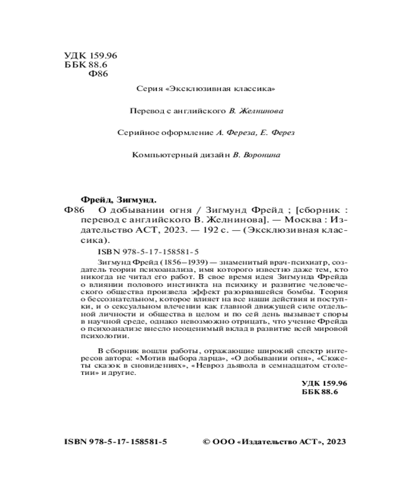 💳 Оплатить за товар можно при получении 🇰🇿 Есть бесплатная доставка по Казахстану от 1 дня 🎁 Копите бонусы с каждой покупки Серия: Эксклюзивная классика Зигмунд Фрейд (1856-1939) — знаменитый врач-психиатр, создатель теории психоанализа, имя которого известно даже тем, кто никогда не читал его работ. В свое время идея Зигмунда Фрейда о влиянии полового инстинкта на психику и развитие человеческого общества произвела эффект разорвавшейся бомбы. Теория о бессознательном, которое влияет на все наши действия и поступки, и о сексуальном влечении как главной движущей силе отдельной личности и общества в целом и по сей день вызывает споры в научной среде, однако невозможно отрицать, что учение Фрейда о психоанализе внесло неоценимый вклад в развитие всей мировой психологии. |