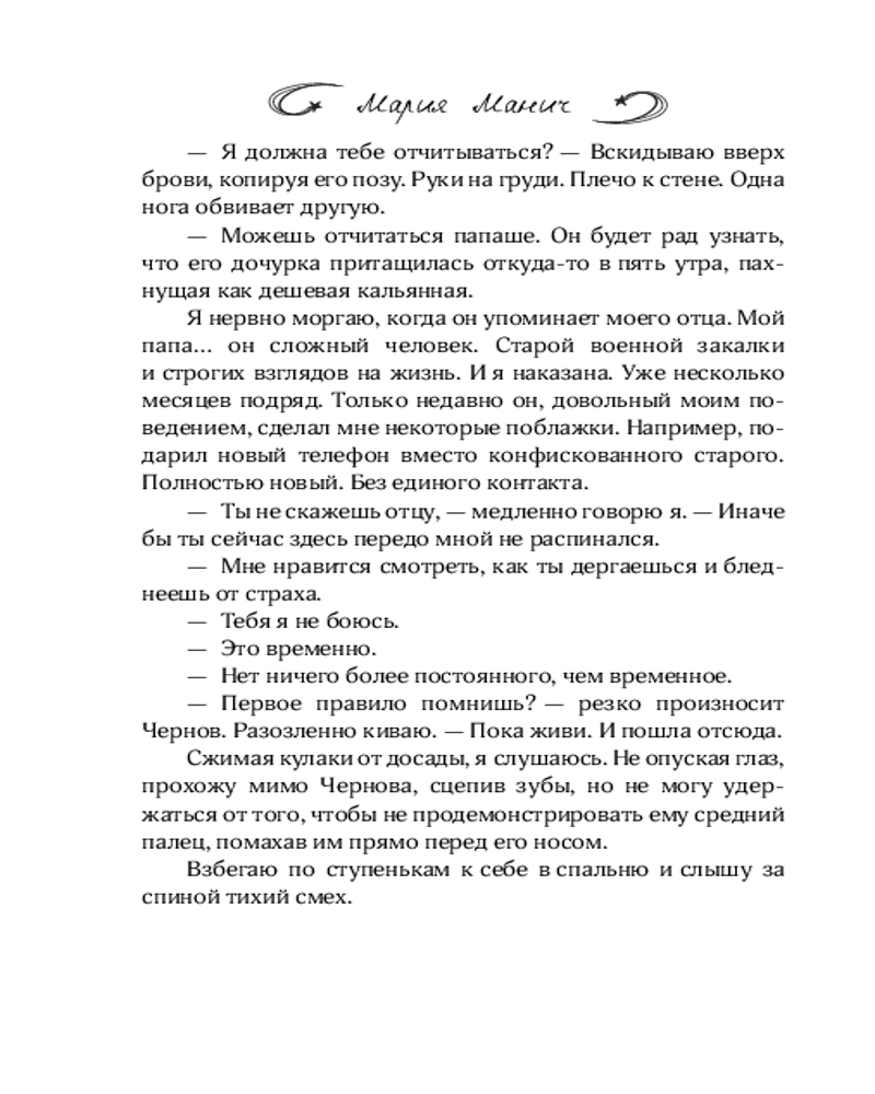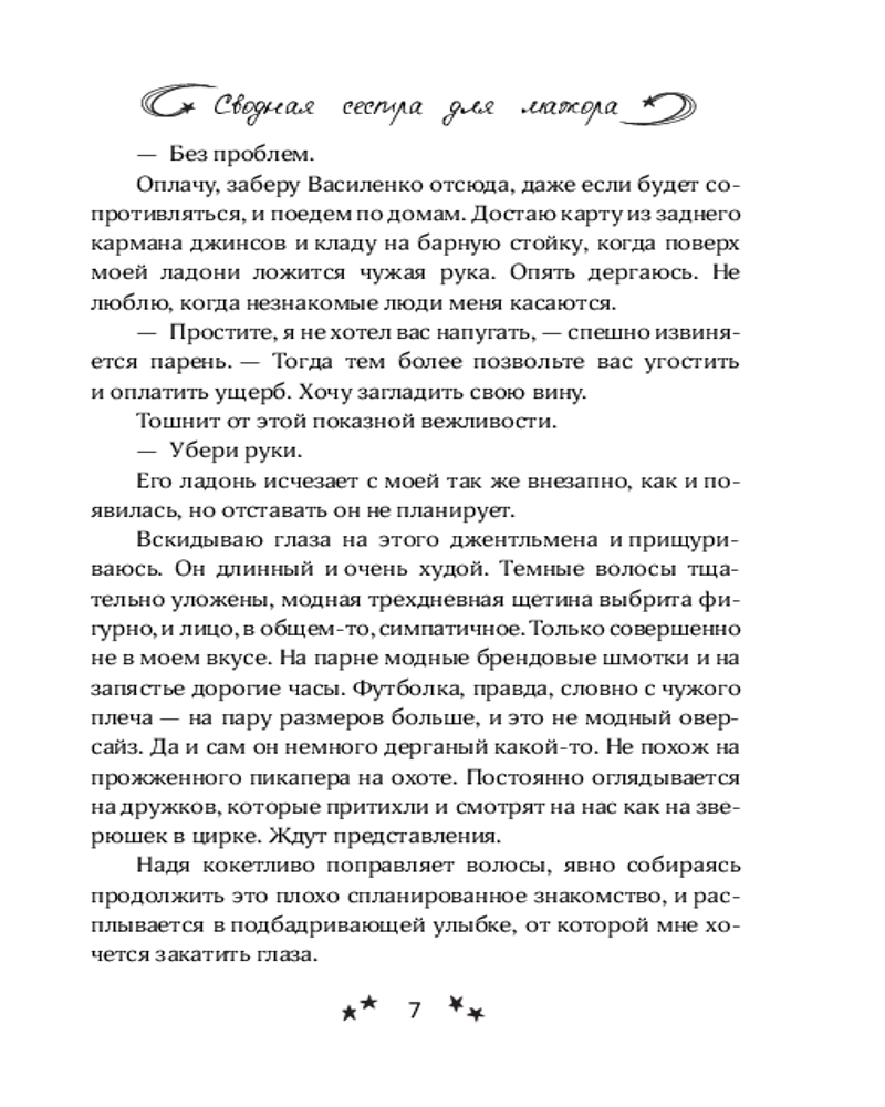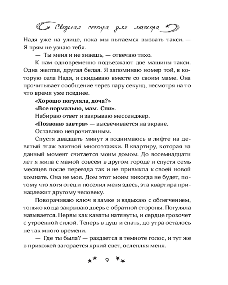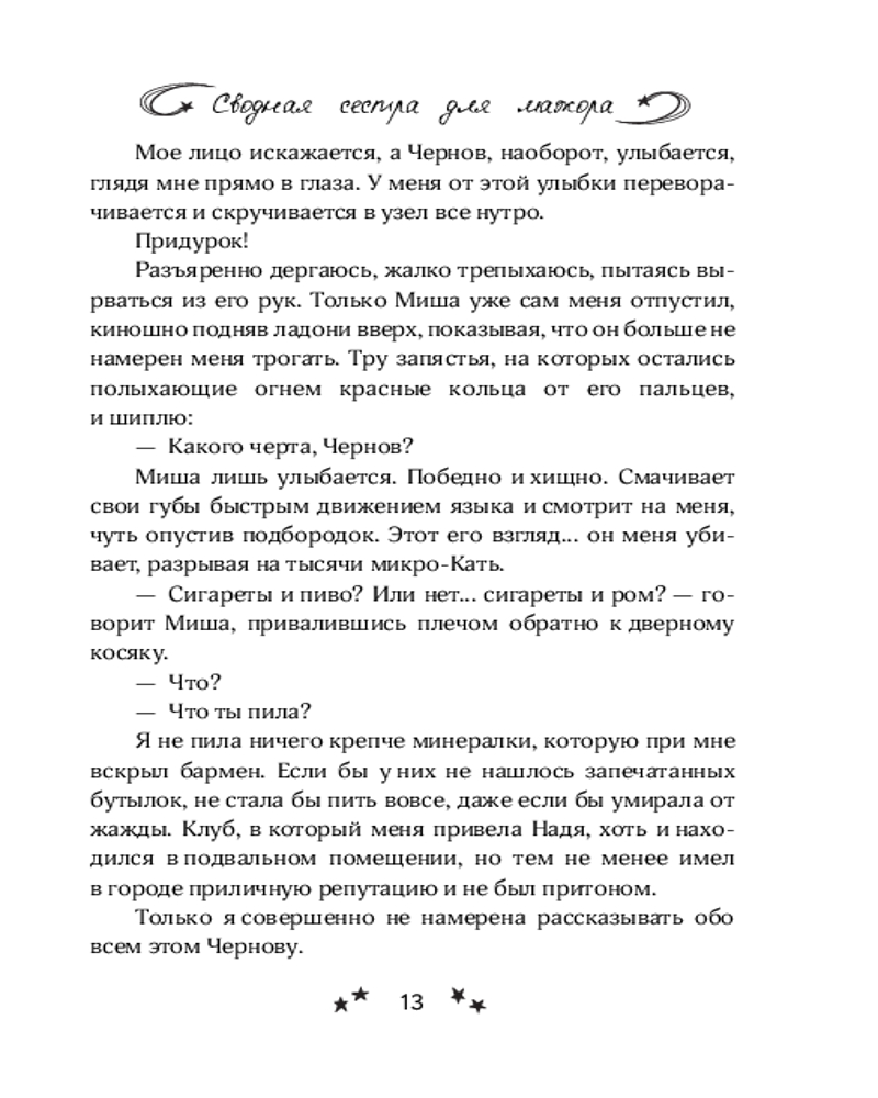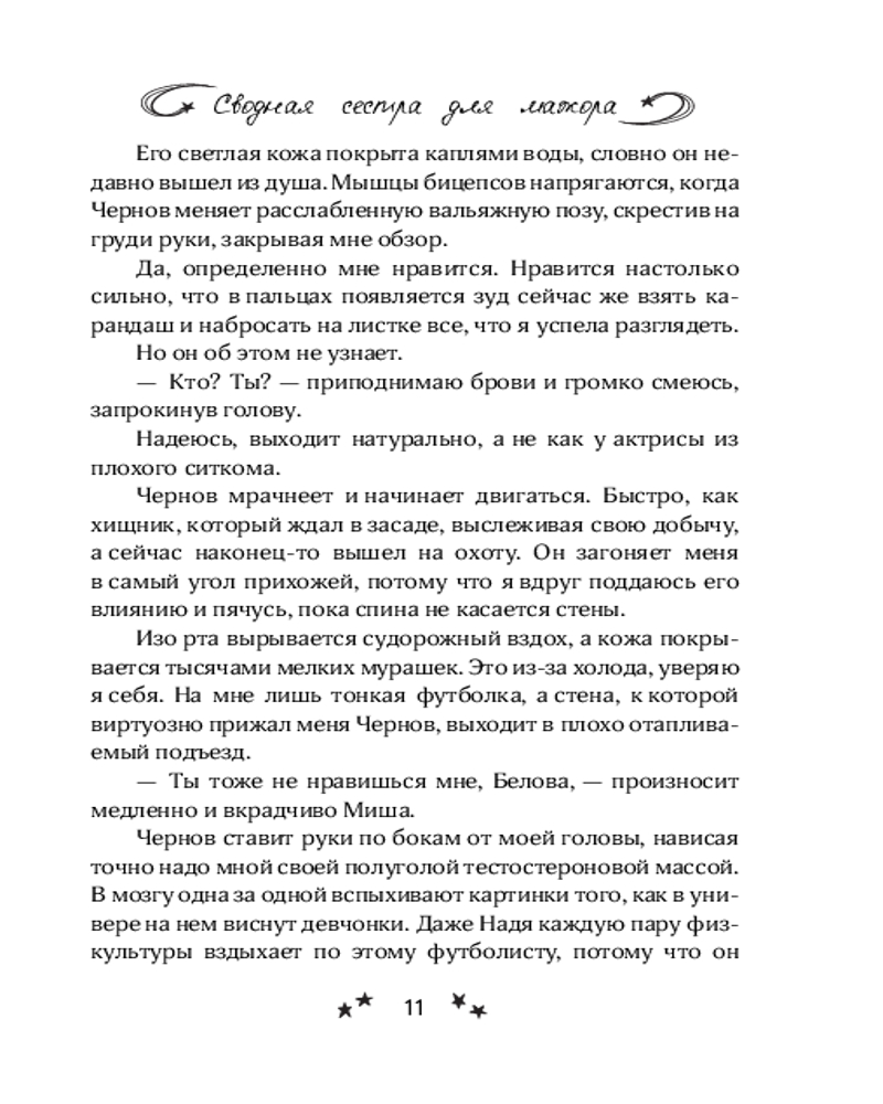 Сводная сестра для мажораВ данный момент этот товар отсутствует в продаже. Возможно, у нас найдется аналогичный или похожий товар здесь. Серия: Звездная коллекция романов о любви (м) Полгода назад моя жизнь изменилась. Мне пришлось сменить город, поступить в посредственный вуз и прикидываться тихоней, которая боится каждого шороха. А еще я внезапно для самой себя влюбилась... в парня, влюбляться в которого категорически нельзя. Он мой сводный брат — надменный, эгоистичный мажор, который думает только о себе и постоянно меняет девушек. Я для него пустое место, помеха, которая своим появлением внесла в его жизнь только неудобства. Он придумал для меня правила, которые мне лучше не нарушать. Но что будет, если он нарушит их первым? |