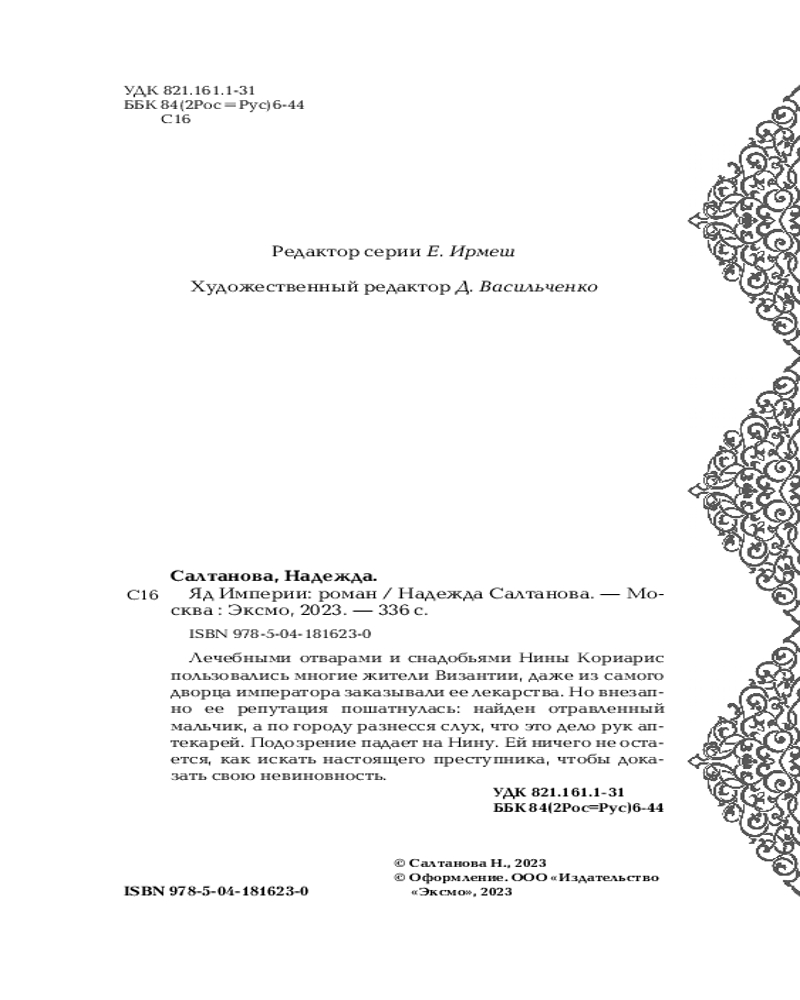 💳 Оплатить за товар можно при получении 🇰🇿 Есть бесплатная доставка по Казахстану от 1 дня 🎁 Копите бонусы с каждой покупки Серия: Убийство в Византии. Исторические детективы Надежды Салтановой Увлекательный и точный в деталях детектив «Яд Империи» поражает атмосферой роскошного Востока и правдоподобным рассказом о жизни средневекового лекаря. Надежда Салтанова, победительница конкурса «Со слов очевидцев», представляет свой дебютный роман, который уже завоевал сердца любителей детективов! |