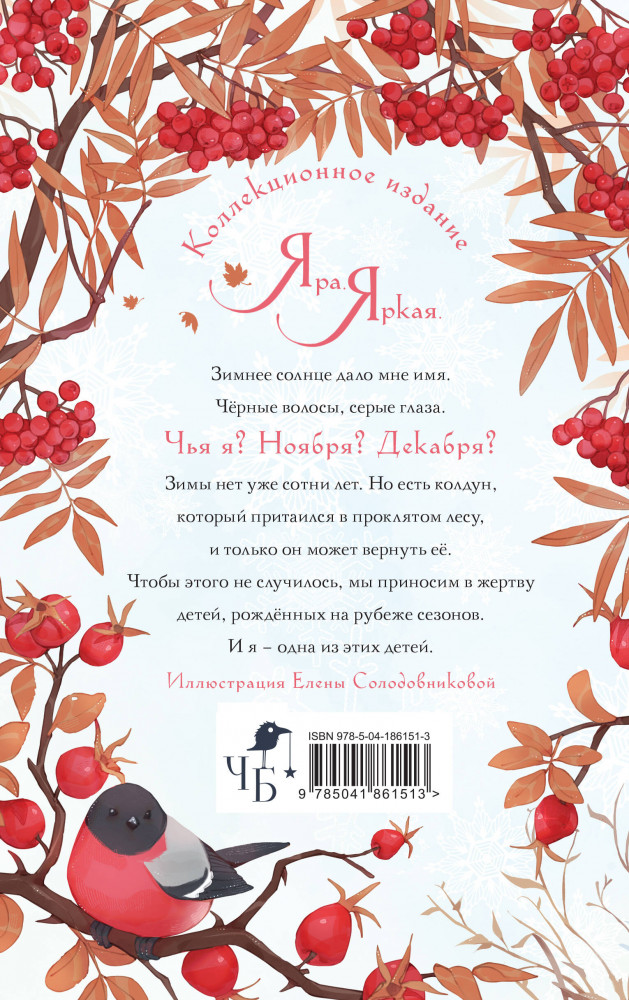 Невеста Ноября. Подарочное изданиеВ данный момент этот товар отсутствует в продаже. Возможно, у нас найдется аналогичный или похожий товар здесь. Серия: Невеста Ноября. Коллекция Коллекционное издание 2024 года! Мама нарекла меня Ярой, в честь яркого солнца, которое отражается от снежного покрова. Но откуда ей было знать, как выглядит снег, если зимы нет уже сотни лет? Единственное место, где ещё сохранились холода — это проклятый лес. Там живёт последний декабрьский колдун, из-за которого зима может однажды вернуться. Люди всеми силами пытаются этому помешать, принося в жертву детей, рождённых в декабре. И я оказалась одной из этих детей. |