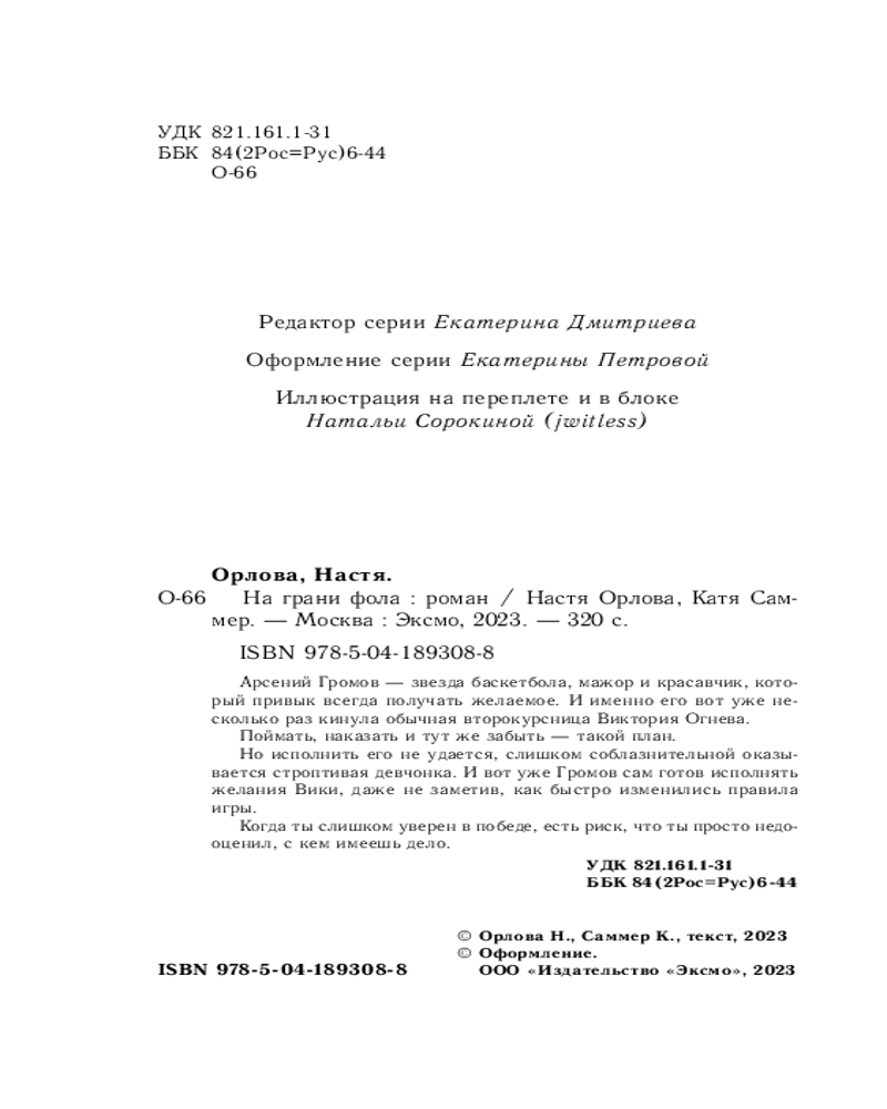 💳 Оплатить за товар можно при получении 🇰🇿 Есть бесплатная доставка по Казахстану от 1 дня 🎁 Копите бонусы с каждой покупки Серия: Всегда побеждает любовь. Проза Насти Орловой Арсений Громов — звезда баскетбола, мажор и красавчик, который привык получать желаемое. И именно его вот уже несколько раз кинула обычная второкурсница Виктория Огнева. Поймать, наказать и тут же забыть — такой план. Но исполнить его не удается, слишком соблазнительной оказывается строптивая девчонка. И вот уже шикарный автомобиль Громова колесит по сельским дорогам в поисках дома неуловимой студентки. А сам громовержец, кажется, не замечает, что правила игры быстро меняются и теперь именно ему предстоит исполнять желания Вики. Думая, что это он все еще рулит процессом. |