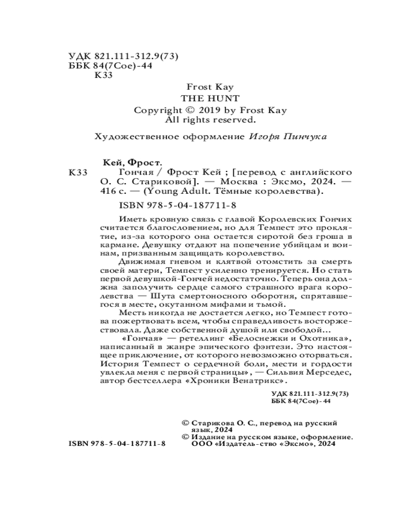 💳 Оплатить за товар можно при получении 🇰🇿 Есть бесплатная доставка по Казахстану от 1 дня 🎁 Копите бонусы с каждой покупки Серия: Young Adult. Тёмные королевства Новое прочтение истории «Белоснежки и Охотника», где девушка отправится за сердцем юноши, но полюбит свою жертву! Первая часть завораживающего young adult фэнтези о Темном королевстве! Роман придется по душе всем, кто любит мрачные ретеллинги, троп от ненависти до любви, очаровательных злодеев, экшен и приключения! Иметь кровную связь с главой Королевских Гончих считается благословением, но для Темпест это проклятие, из-за которого она остается сиротой без гроша в кармане. Девушку отдают на попечение убийцам и воинам, призванным защищать королевство. |