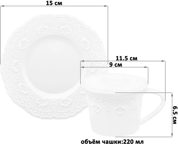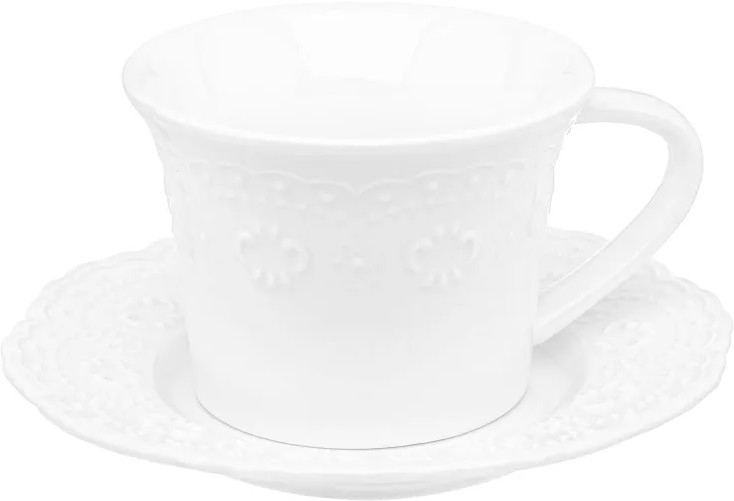 Чайный набор серии «Белый узор» включает 12 предметов. Используйте набор как чайный или кофейный. Чашка с блюдцем помогут провести множество вкусных завтраков с капучино или латте или уютных вечеров с любимым горячим напитком. Набор выполнен из высококачественного белого фарфора и украшен декоративными рельефными узорами. Фарфоровая посуда отличается от керамики повышенной плотностью. Фарфор не впитывает цвет кофе или чая и не деформируется от влаги, чему может быть подвержена керамическая посуда. Красивая чайная пара из серии посуды «Белый узор» станет настоящим украшением вашей сервировки или приятным подарком для родных и близких.