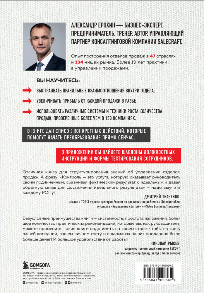 Серия: Бизнес. Как это работает в России Александр Ерохин — бизнес-эксперт, предприниматель, тренер, автор, управляющий партнер консалтинговой компании Salecraft. Опыт построения отделов продаж в 47 отраслях и 134 нишах рынка. Более 19 лет практики в управлении продажами. |