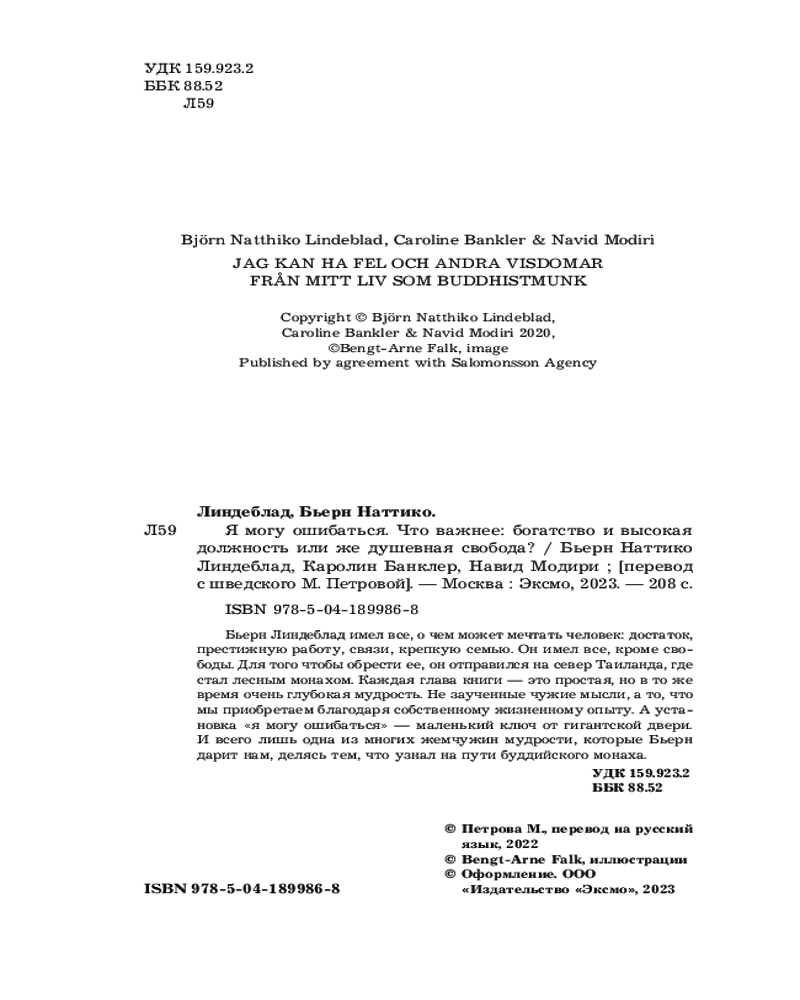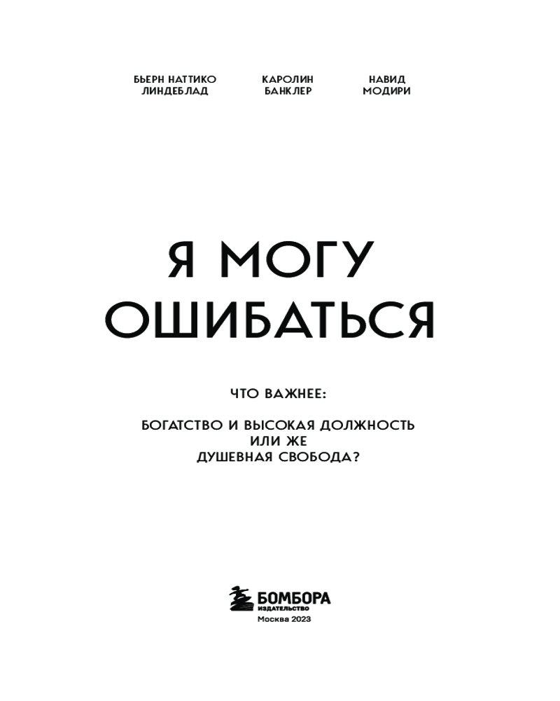 Я могу ошибаться. Что важнее: богатство и высокая должность или же душевная свобода?В данный момент этот товар отсутствует в продаже. Возможно, у нас найдется аналогичный или похожий товар здесь. Серия: Бестселлеры саморазвития Жизнь Бьерна Линдеблада, казалось, была идеальна. Самый молодой в истории коммерческий директор международной компании, дом у моря, друзья-банкиры, личный водитель и секретарь. Он имел все, о чем можно мечтать. Но не свободу. |