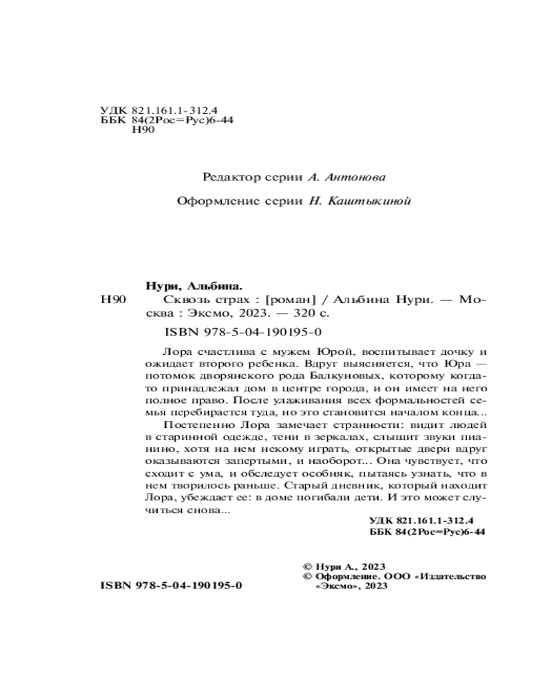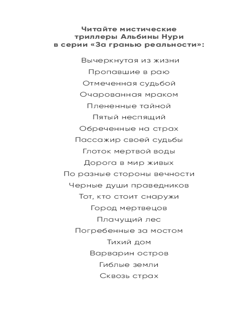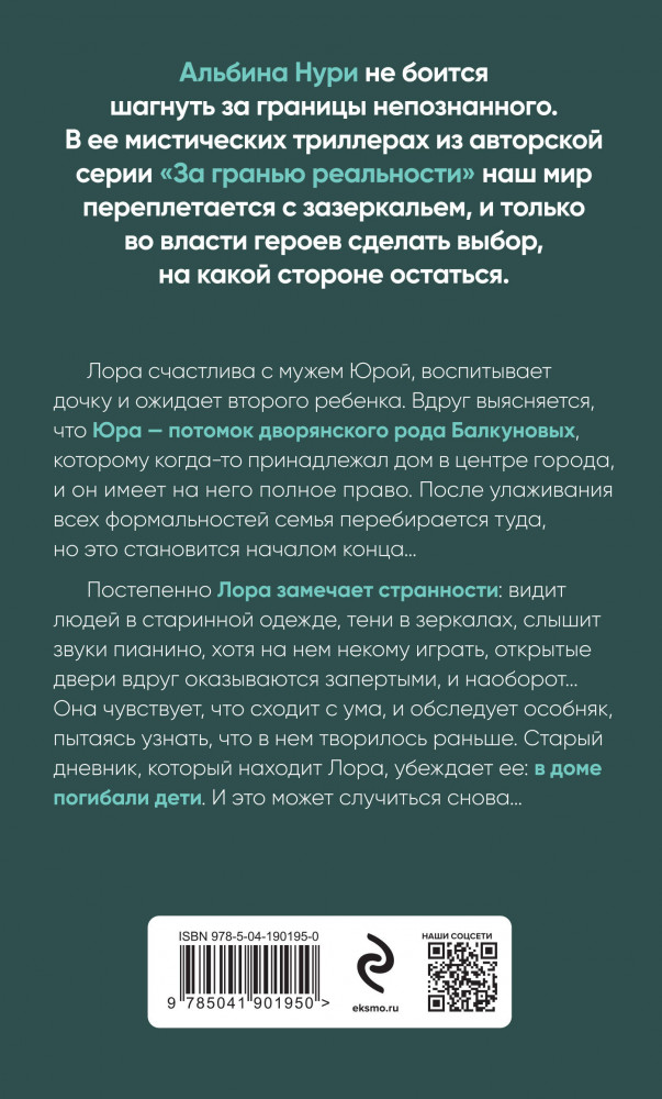 💳 Оплатить за товар можно при получении 🇰🇿 Есть бесплатная доставка по Казахстану от 1 дня 🎁 Копите бонусы с каждой покупки Серия: За гранью реальности. Мистические триллеры Альбины Нури Лора счастлива с мужем Юрой, воспитывает дочку и ожидает второго ребенка. Вдруг выясняется, что Юра — потомок дворянского рода Балкуновых, которому когда-то принадлежал дом в центре города, и он имеет на него полное право. После улаживания всех формальностей семья перебирается туда, но это становится началом конца... Постепенно Лора замечает странности: видит людей в старинной одежде, тени в зеркалах, слышит звуки пианино, хотя на нем некому играть, открытые двери вдруг оказываются запертыми, и наоборот... Она чувствует, что сходит с ума, и обследует особняк, пытаясь узнать, что в нем творилось раньше. Старый дневник, который находит Лора, убеждает ее: в доме погибали дети. И это может случиться снова... |