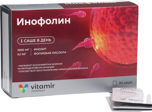 Инозит нередко называют витамином В8, однако, учитывая, что 75 % необходимого суточного количества этого соединения вырабатывается в организме, его следует относить к группе витаминоподобных веществ. Основной формой инозита в организме является миоинозитол. Это один из продуктов метаболизма, оказывающий значительное воздействие на состояние и деятельность многих органов, в том числе репродуктивной системы. Он используется яичниками в процессе синтеза половых гормонов, позитивно влияет на созревание и оплодотворяемость ооцитов ― женских половых клеток, участвующих в образовании эмбриона. У мужчин мио-инозитол улучшает подвижность сперматозоидов ― половых клеток, регулирует содержание необходимых компонентов семенной жидкости и ее объем. Он способствует построению белков, необходимых для правильного развития эмбриона. Мио-инозитол принимает участие в процессах гормональной регуляции менструального цикла, поддержания овуляции, тем самым увеличивая вероятность самопроизвольной беременности. Сравнительно недавно он стал рассматриваться как средство, облегчающее ее нормальное течение, эффективное при вспомогательной репродукции. Важно, что миоинозитол и фолаты во многом осуществляют одни и те же или схожие функции. Поэтому в практике репродуктологии эти вещества используются совместно.