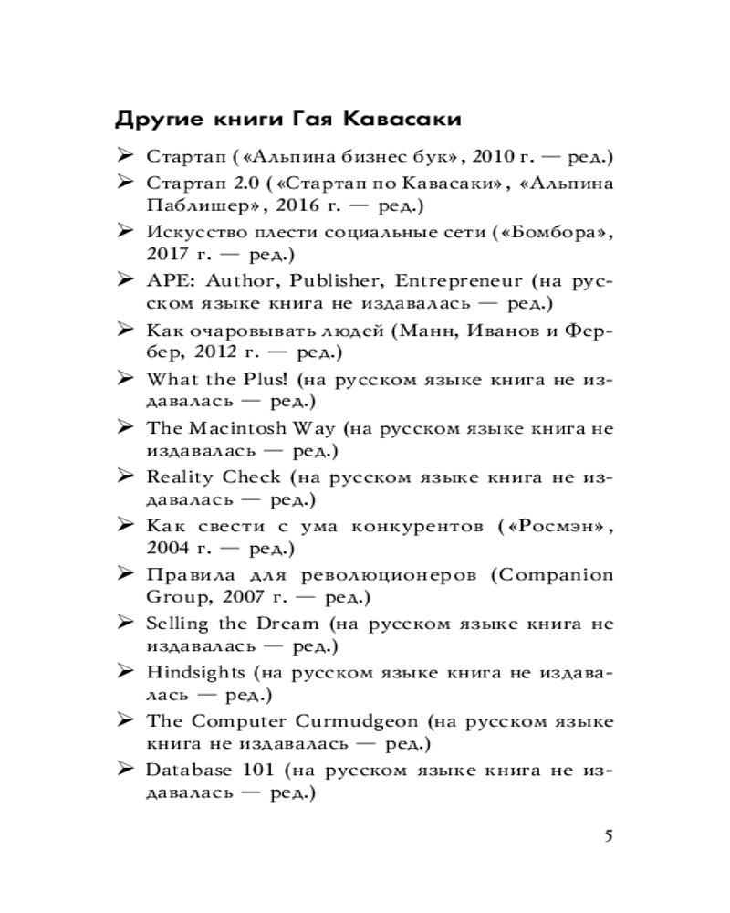 В данный момент этот товар отсутствует в продаже. Возможно, у нас найдется аналогичный или похожий товар здесь. Серия: Книги, о которых говорят Однажды Стив Джобс дал совет: «Оставляйте вмятину во Вселенной». Гай Кавасаки тот человек, который не просто оставил вмятину, а продырявил Вселенную насквозь. Джобс не был впечатлен его кандидатурой при приеме на работу, тем не менее Кавасаки добился в Apple выдающихся результатов, заставив весь мир фанатеть от их продукции. Эта книга не является автобиографией, скорее это коллекция поучительных историй, которые дают знания. Она содержит 183 мудрых совета от иконы Кремниевой долины, многие из которых бесценны, а некоторые стоят более 2,5 миллиардов долларов.