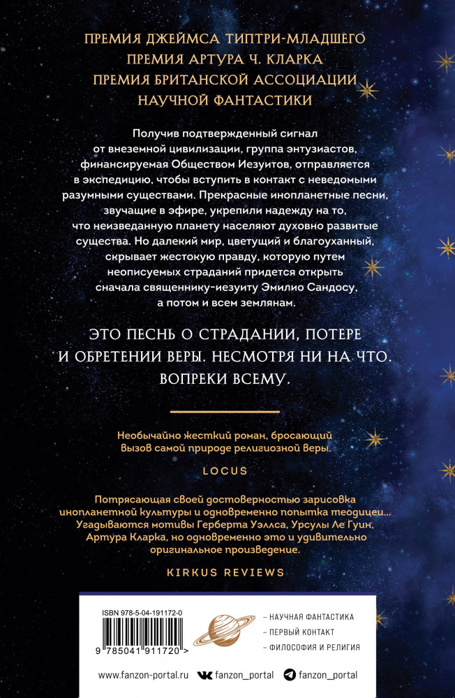 💳 Оплатить за товар можно при получении 🇰🇿 Есть бесплатная доставка по Казахстану от 1 дня 🎁 Копите бонусы с каждой покупки Серия: Fanzon. Sci-Fi Universe. Большой покет с клапанами На плечи Эмилио Сандоса, харизматичного священника-иезуита и лингвиста, ложится ответственная миссия, порученная Обществом Иисуса — установить первый контакт с разумной внеземной цивилизацией. Вместе с астрономом, инженером, врачом, специалистом по компьютерам и тремя другими миссионерами он отправляется на планету Ракхат, но экспедиция, которая была призвана доказать существование Бога во вселенной, заканчивается ужасной катастрофой. |