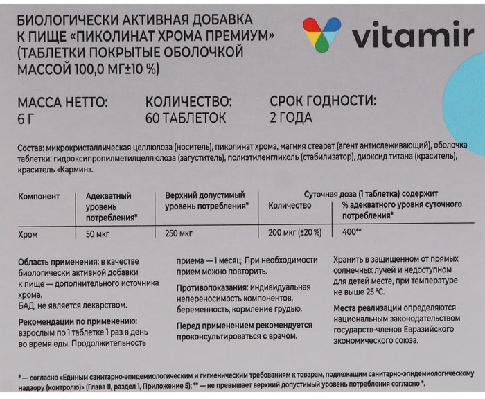 Витамир Таблетки «Пиколинат хрома Премиум»-40% +57 похудение снижение тяги легко переносится не работает