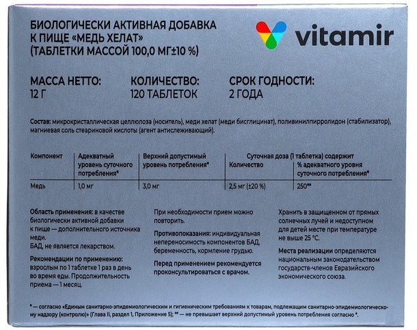 Витамир Таблетки «Медь хелат»-25% +52 эффективность здоровье для волос