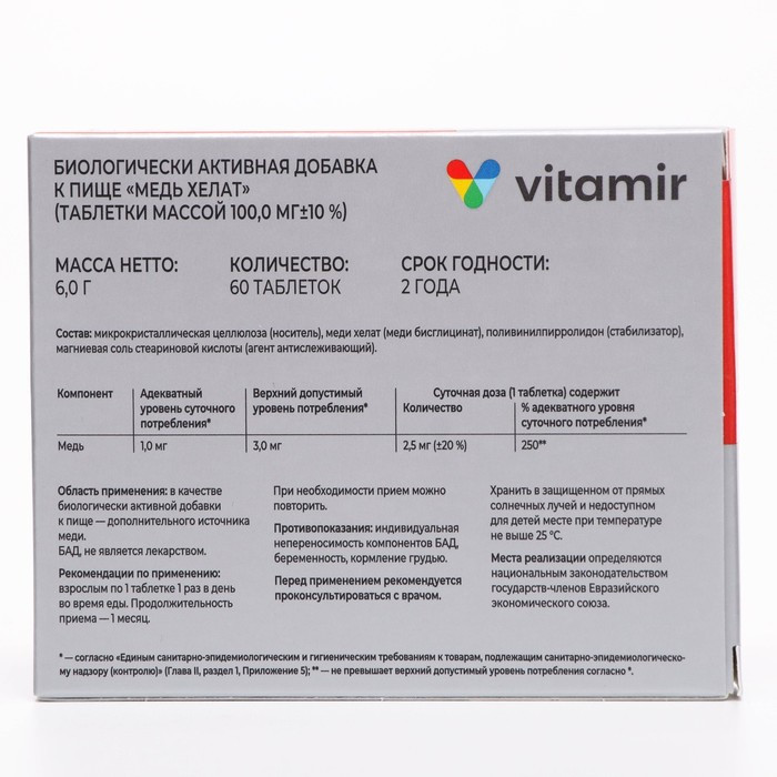 Витамир Таблетки «Медь хелат»В данный момент этот товар отсутствует в продаже. Возможно, у нас найдется аналогичный или похожий товар здесь. Биологически активная добавка к пище, дополнительный источник меди, необходимой для работы иммунной системы и правильного протекания обменных процессов. Медь — жизненно важный микроэлемент для организма человека, который влияет на активность витаминов, гормонов и ферментов. Она участвует во многих процессах обмена веществ, способствует поддержанию иммунной системы организма, повышая его сопротивляемость инфекциям, обеспечивает усвоение железа. Способствует укреплению костей и суставов, поддержанию тонуса кожи и стенок сосудов. |