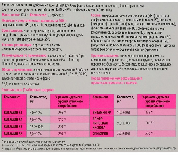 Витамир Таблетки «Slimtabs»В данный момент этот товар отсутствует в продаже. Возможно, у нас найдется аналогичный или похожий товар здесь. Иметь хорошую фигуру и быть здоровым — мечта каждого человека. К сожалению, современный ритм жизни диктует свои условия. Перекусы на бегу, стрессы, рабочие цейтноты, недостаток физической активности могут стать дополнительными препятствиями на пути к красивой и стройной фигуре. Сбросить лишний вес без мучительных диет и голоданий — разве не об этом думает каждый, кто хочет похудеть? Безудержный голод — большая проблема, когда пытаешься сбросить вес, особенно, если только недавно начал тренироваться и оказалось, что есть хочется всегда! Благодаря действию входящего в состав БАД «Slimtabs. Синефрин и альфа-липоевая кислота, блокатор аппетита, сжигатель жира, ускорение метаболизма» синефрина увеличивается концентрация глюкозы в крови, в то же время альфа-липоевая кислота воздействует на рецепторы, которые блокируют сигнал голода. Таким образом, насыщение от еды приходит быстрее и длится дольше. Компоненты Slimtabs помогают блокировать аппетит, но это вовсе не значит, что Вы совсем перестанете есть, просто контролировать этот процесс станет проще. |