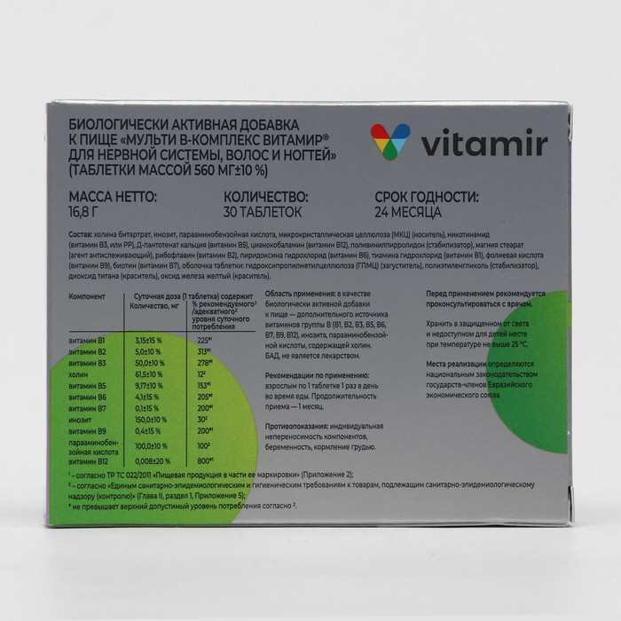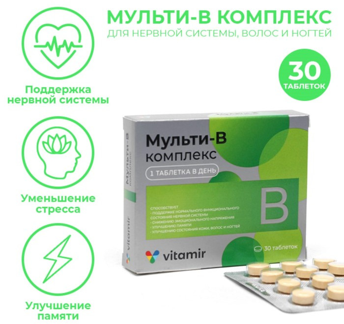 Витамир Комплекс «Мульти-» данный момент этот товар отсутствует в продаже. Возможно, у нас найдется аналогичный или похожий товар здесь. «Мульти В-комплекс для нервной системы, волос и ногтей» содержит в своем составе 11 витаминов группы В. Витамины группы В — это целая группа водорастворимых соединений, принимающих участие во всех обменных процессах, протекающих в организме и способствующих высвобождению энергии из различных пищевых веществ, где присутствуют калории. У всех витаминов группы В есть общая функция — улучшать обмен веществ в организме и нормализовать работу иммунной и нервной систем. Большинство из них благотворно влияет на состояние кожи, волос и ногтей. Причем действие этих витаминов в комплексе гораздо более эффективно, чем если принимать какой-либо из витаминов группы B в отдельности. Излишки водорастворимых витаминов быстро выводятся из организма, не накапливаясь в нем, поэтому необходимо пополнять их запасы, употребляя пищу, богатую этими веществами и принимая добавки. |