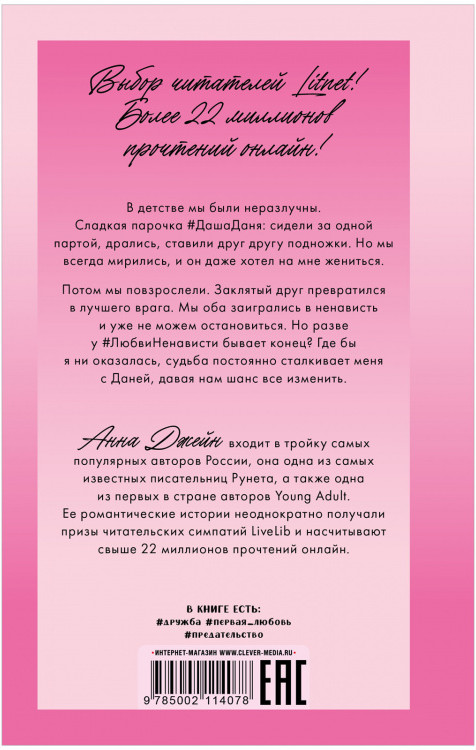 #ЛюбовьНенавистьВ данный момент этот товар отсутствует в продаже. Возможно, у нас найдется аналогичный или похожий товар здесь. Серия: #Trendbooks_love В детстве мы были неразлучны. Сладкая парочка #ДашаДаня сидели за одной партой, дрались, ставили друг другу подножки. Но мы всегда мирились, и он даже хотел на мне жениться. Потом мы повзрослели. Заклятый друг превратился в лучшего врага. Мы оба заигрались в ненависть и уже не можем остановиться. Но разве у #ЛюбвиНенависти бывает конец? Где бы я ни оказалась, судьба постоянно сталкивает меня с Даней, давая нам шанс все изменить. |