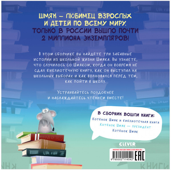 В данный момент этот товар отсутствует в продаже. Возможно, у нас найдется аналогичный или похожий товар здесь. Серия: Котенок Шмяк В этом сборнике вы найдёте три забавные истории из школьной жизни Шмяка. Вы узнаете, что случилось со Шмяком, когда он вовремя не сдал библиотечную книгу, как он выступал на школьных выборах и как волновался перед тем, как пойти в школу. Устраивайтесь поудобнее и наслаждайтесь чтением вместе!