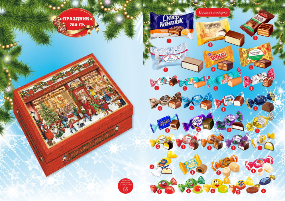 Сахар, патока кукурузная, жир растительный гидрогенизированный, рафинированные, дезодорированные растительные масла: пальмовое и его фракции, пальмоядровое, подсолнечное, кокосовое, масло орехов (и/или) иллипеое, антиокислители Е 319, Е 330, эмульгаторы Е 492, лецитин), молоко цельное сгущенное с сахаром (лактоза), какао-порошок, какао тертое, молоко сухое обезжиренное, цельное, мука пшеничная высшего и первого сорта, масло сливочное, масло какао, сыворотка молочная сухая, маргарин (рафинированные, дезодорированные растительные масла в натуральном и отвержденном виде, вода, эмульгаторы Е 471, ароматизатор, лимонная кислота, краситель натуральный аннато-куркумин), подварка яблочная (пюре яблочное), ядро арахиса жареное, агент влагоудерживающий сорбит, молоко сухое карамелизованное, Е 476, Е 472; регуляторы кислотности: кислота молочная, цитрат натрия; агент желирующий агар, коньяк, продукты яичные (белок яичный сухой, яичный порошок), крахмал кукурузный сухой, сливки сухие, спирт этиловый пищевой, сок клубничный, красители натуральные: Е 120, Е 160с, «концентрат сока черной моркови», Е 160а, Е100; вафельная крошка, соль поваренная пищевая, краситель Е 171, технологическое вспомогательное средство: желатин пищевой, ферментный препарат инвертаза; трюфель, агент желирующий каррагинан, разхрыхлитель карбонат аммония, глазирователь капол (глазирователь Е 903 (5-12%), антиокислитель Е 307, Е 330), йогуртовый порошок (йогуртовые культуры), соки концентрированные: мультиягоды, малиновый, абрикосовый, вишневый; пюре: клубничное, банановое.