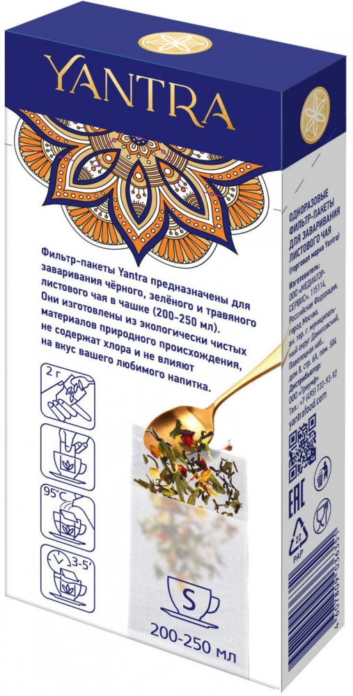 Yantra Фильтр-пакеты для заваривания листового чаяВ данный момент этот товар отсутствует в продаже. Возможно, у нас найдется аналогичный или похожий товар здесь. Фильтр-пакеты «Янтра» предназначены для заваривания всех видов чаев: черных, зеленых, травяных. В любом объеме: от чашки на 200 мл до чайника 1 л. Они изготовлены из экологически чистых материалов природного происхождения, не содержат хлор и не влияют на вкус любимого напитка. Все материалы упаковки подлежат вторичной переработке. Одноразовые фильтр-пакеты размера S. Для заваривания в чашке или кружке на 200-250 мл. |