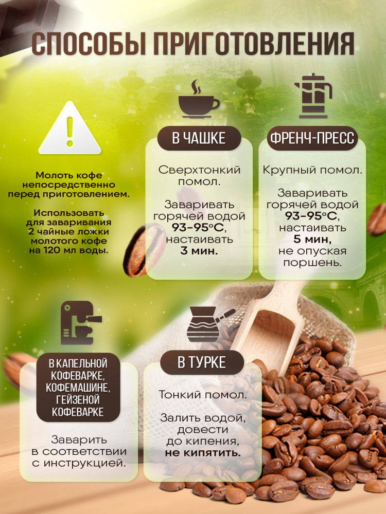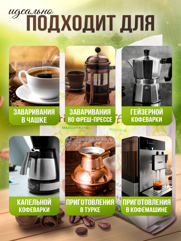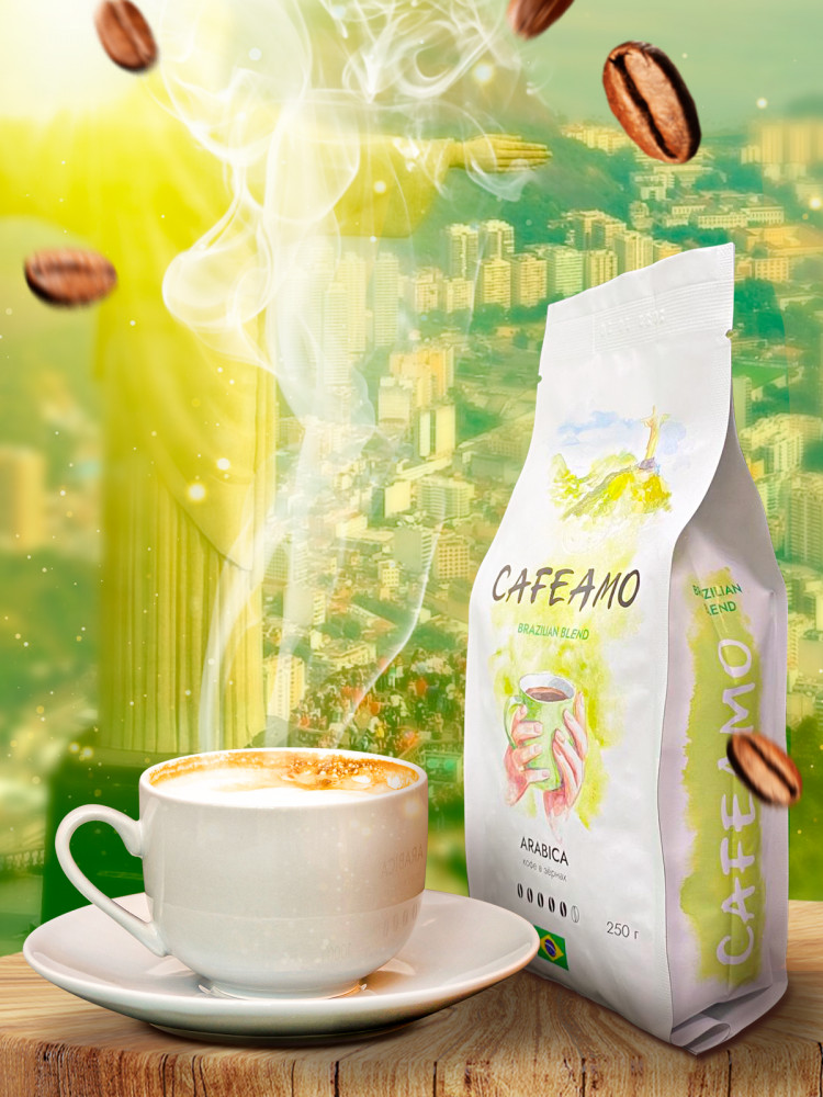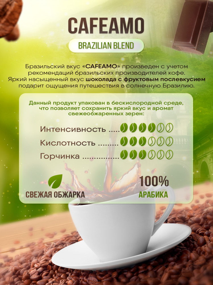 Этот зерновой кофе создан с учетом рекомендаций высококлассных производителей из Бразилии, что гарантирует насыщенный и уникальный вкус. Прекрасная комбинация шоколадных нот и фруктового послевкусия создают неповторимое ощущение путешествия в солнечную Бразилию. Но не только качество зерен делает «Cafeamo» особенным. Он уникален еще и своим образом приготовления. Благодаря своей универсальности, он подойдет для приготовления в любой кофемашине: от аэропресса до турки. Светлая степень обжарки позволяет полнее раскрыть ароматы и сохранить в его вкусе всю натуральность. Вы можете насладиться «Cafeamo» во множестве вариаций. Получится идеальный капучино или латте, которым захочется наслаждаться утром или в любое время дня. Если вы предпочитаете более простой вкус, то американо станет идеальным выбором для вас.
