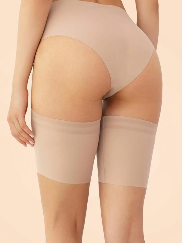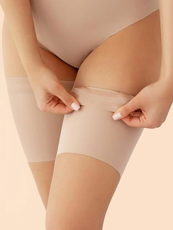 Хороший оттенок, отлично подошел к коже. Очень широкие, но подтянуть близко к трусикам не получается - начинают скатываться. Силиконовые ленты только по верхнему краю, вроде бы держатся, но если край скатается вместе с ними, вся бандалетка сползет с ноги. После открытия упаковки ужасно воняли, после стирки все нормализовалось (стирка на руках). Главный недостаток - не пропускают воду, значит под ними очень сильно будут потеть бедра, для лета нужны ткань, отводящая пот, а не задерживающая его.