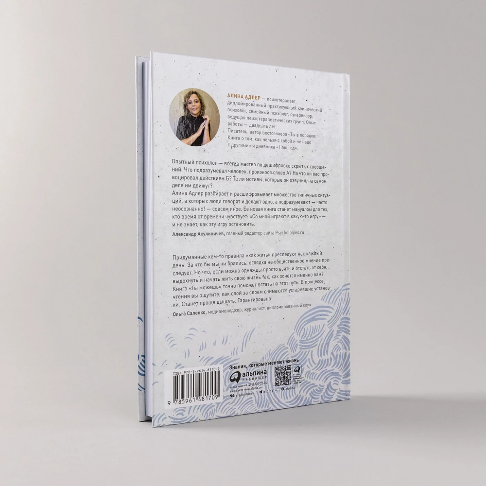 Очень рада, что на моём жизненном пути встретился такой опытный психолог, как Алина Адлер. Моё первое знакомство случилось год назад, когда в моих руках оказалась книга "Ты в порядке". С первых страниц я получила ответы на волнующие душу вопросы и пришло одно из важных осознаний - быть неидеальным, ошибаться, чувствовать и проживать всю палитру эмоций - это нормально! Книга "Ты можешь!" продолжила увлекательное знакомство с автором, его жизненным и профессиональным опытом. Каждая глава помогает переосмыслить свои жизненные взгляды, заглянуть вглубь себя и приблизиться к себе настоящей, дотронуться до самых тонких и чувствительных струн души и осознать, что смысл жизни - сама жизнь!
