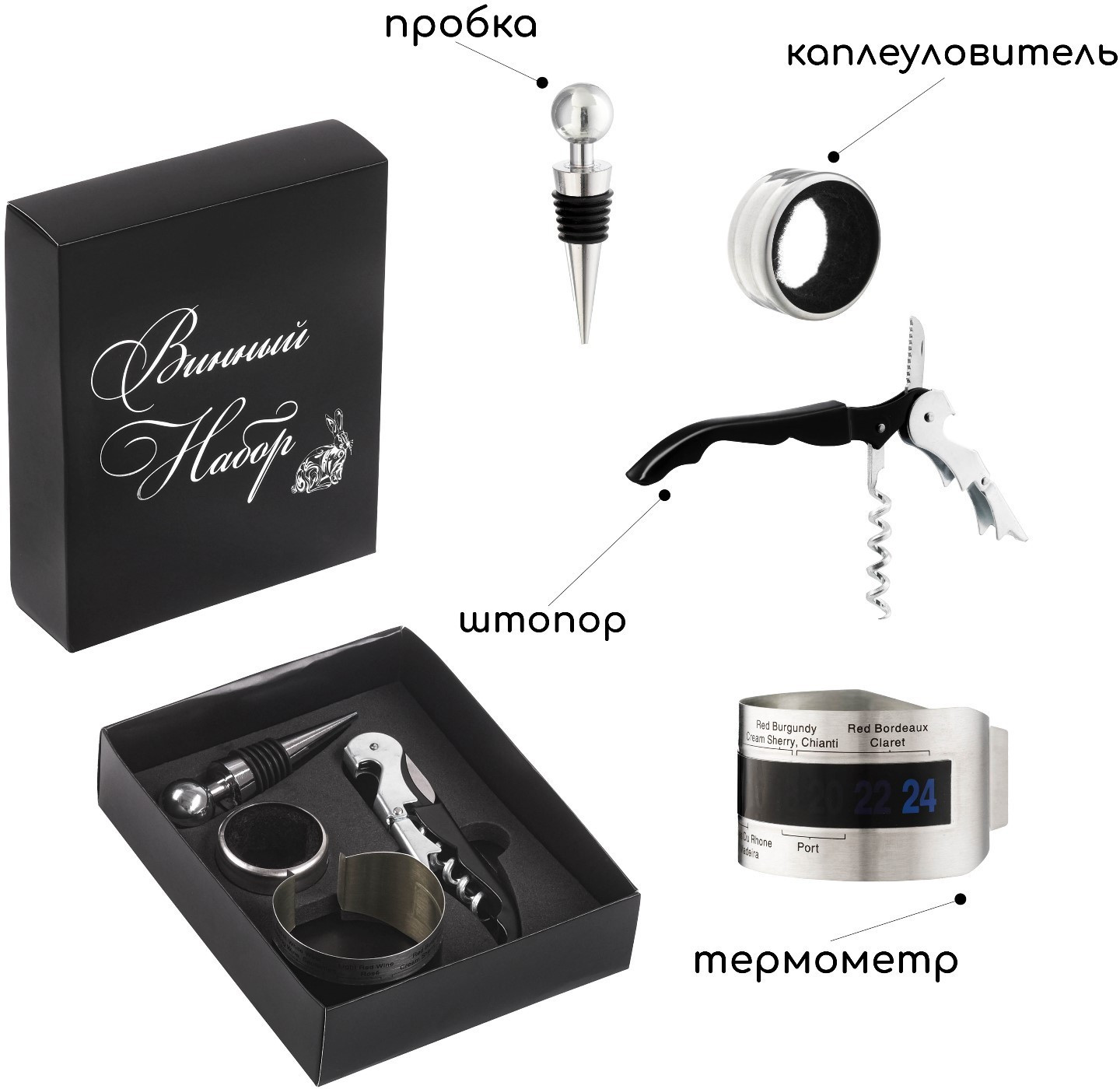 Набор для вина «Сомелье»В данный момент этот товар отсутствует в продаже. Возможно, у нас найдется аналогичный или похожий товар здесь. Серия: Новый год Аксессуары для вина относятся к универсальной разновидности памятных подарков, уместных в любом случае — будь то день рождения коллеги по работе или новоселье близкого друга. Набор сомелье станет отличным подарком для любителей и ценителей вина. |