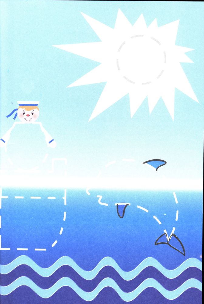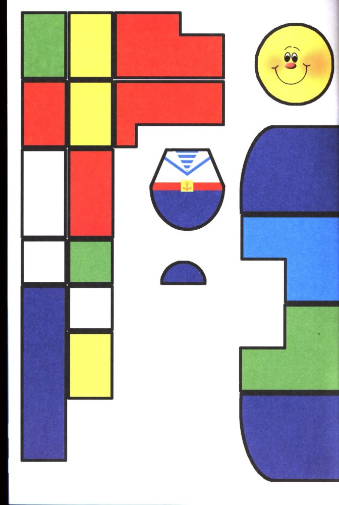 Серия «Простые картинки». Книжка очень тонкая, всего два листа — обложка и лист для вырезания. Лист лучше не отрывать, а аккуратно разогнуть скрепки. Зато внутренний фон обложки цветной, разрисованный — море с волнами. Если наклеить на картонку, получится небольшая картина. В отличие от серии «Произвольное наклеивание», на обложке обозначено место для наклеивания. Уменьшенный образец готовой картинки есть на листе с заготовками. Форма фигур несложная, можно вырезать ровно по контуру.