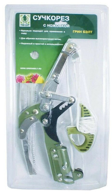 Сучкорез с ножовкой Грин Бэлт применяется для обрезания сучков и веток, расположенных высоко. Снабжен прочным капроновым шнуром-тягой. Длина ножовки 30 см. Насаживается на длинный черенок (приобретается отдельно).