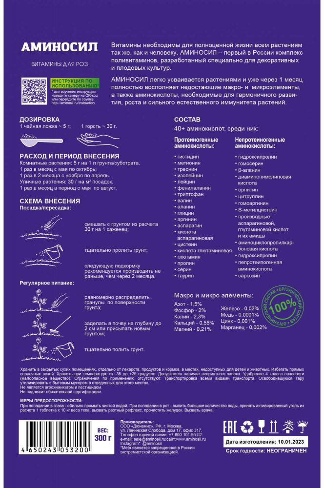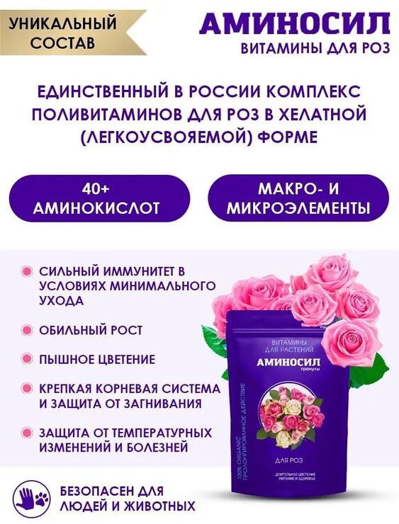 💳 Оплатить за товар можно при получении 🇰🇿 Есть бесплатная доставка по Казахстану от 1 дня 🎁 Копите бонусы с каждой покупки Полный комплекс витаминов для роз. 100% органический состав. Аминосил создан для полноценного сбалансированного питания всех типов роз. Витамины Аминосил укрепляют растение, защищают корневую систему, формируют сильный естественный иммунитет, повышает стрессоустойчивость. Аминосил выполняет для роз ту же функцию, что и традиционные витамины для человека, позволяя жить полноценной здоровой жизнью даже при стрессовых ситуациях. Благодаря микро и макро-элементам органического происхождения Аминосил дарит розам длительное и интенсивное цветение, а так же обеспечивает качественный рост и развитие растения. Витамины Аминосил принимают активное участие в процессе метаболизма растений. По сути, они представляют собой элементы или кирпичики, благодаря которыми происходит строительство растительных клеток. |