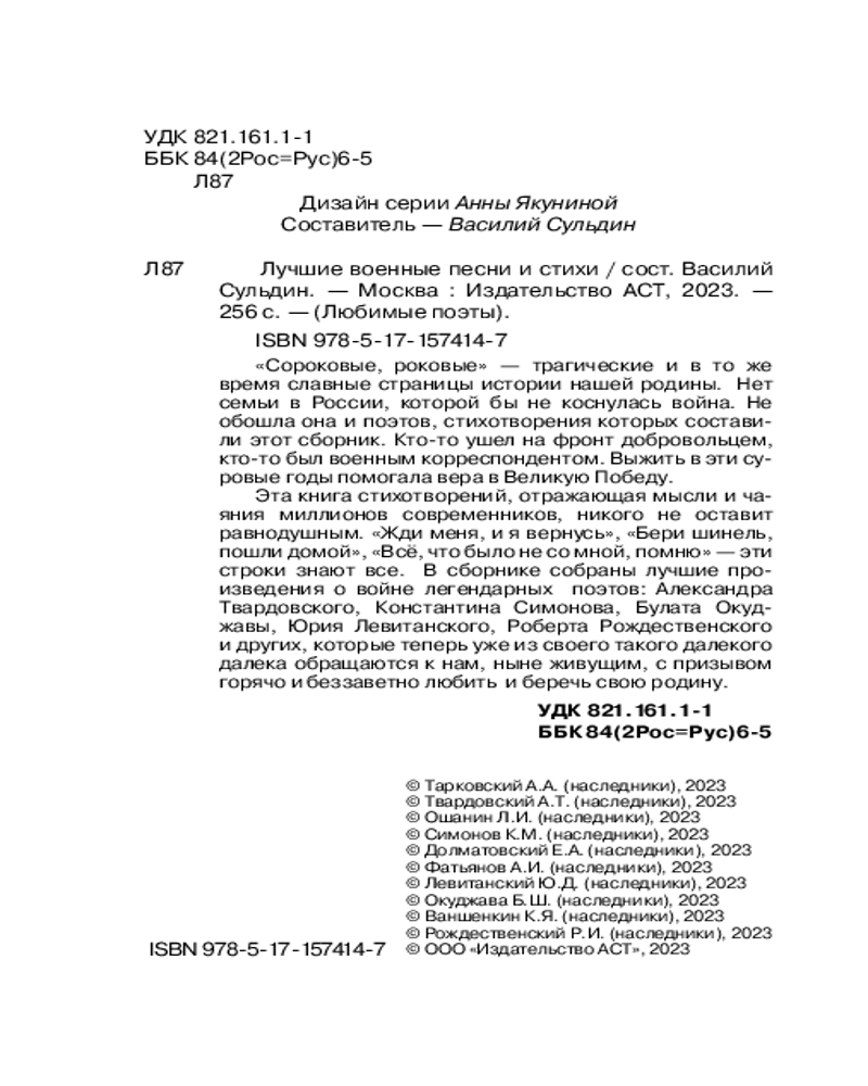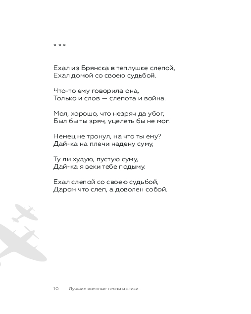 Лучшие военные песни и стихиВ данный момент этот товар отсутствует в продаже. Возможно, у нас найдется аналогичный или похожий товар здесь. Серия: Любимые поэты «Сороковые, роковые» — трагические и в то же время славные страницы истории нашей родины. Нет семьи в России, которой бы не коснулась война. Не обошла она и поэтов, стихотворения которых составили этот сборник. Кто-то ушел на фронт добровольцем, кто-то был военным корреспондентом. Выжить в эти суровые годы помогала вера в Великую Победу. |