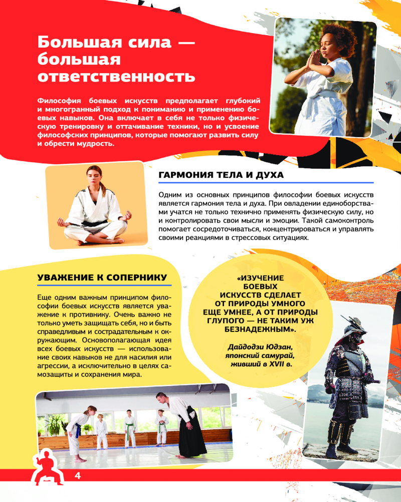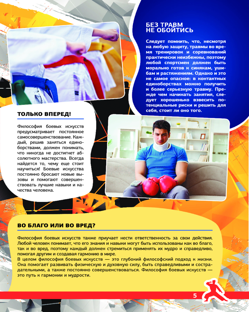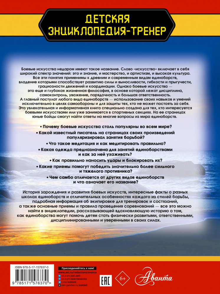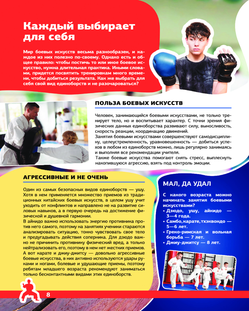 Боевые искусстваВ данный момент этот товар отсутствует в продаже. Возможно, у нас найдется аналогичный или похожий товар здесь. Серия: Детская энциклопедия-тренер Эта книга — не только богатый источник знаний о древних и современных боевых искусствах, но и практическое руководство для детей, желающих заниматься единоборствами. Издание рассказывает о самых популярных в мире видах боевых искусств: карате, айкидо, тхэквондо, кунг-фу, джиу-джитсу, дзюдо и самбо. Все стили представлены с подробным описанием истории их зарождения и развития, особый акцент сделан на особенностях, техниках и философских принципах каждого из них. |
